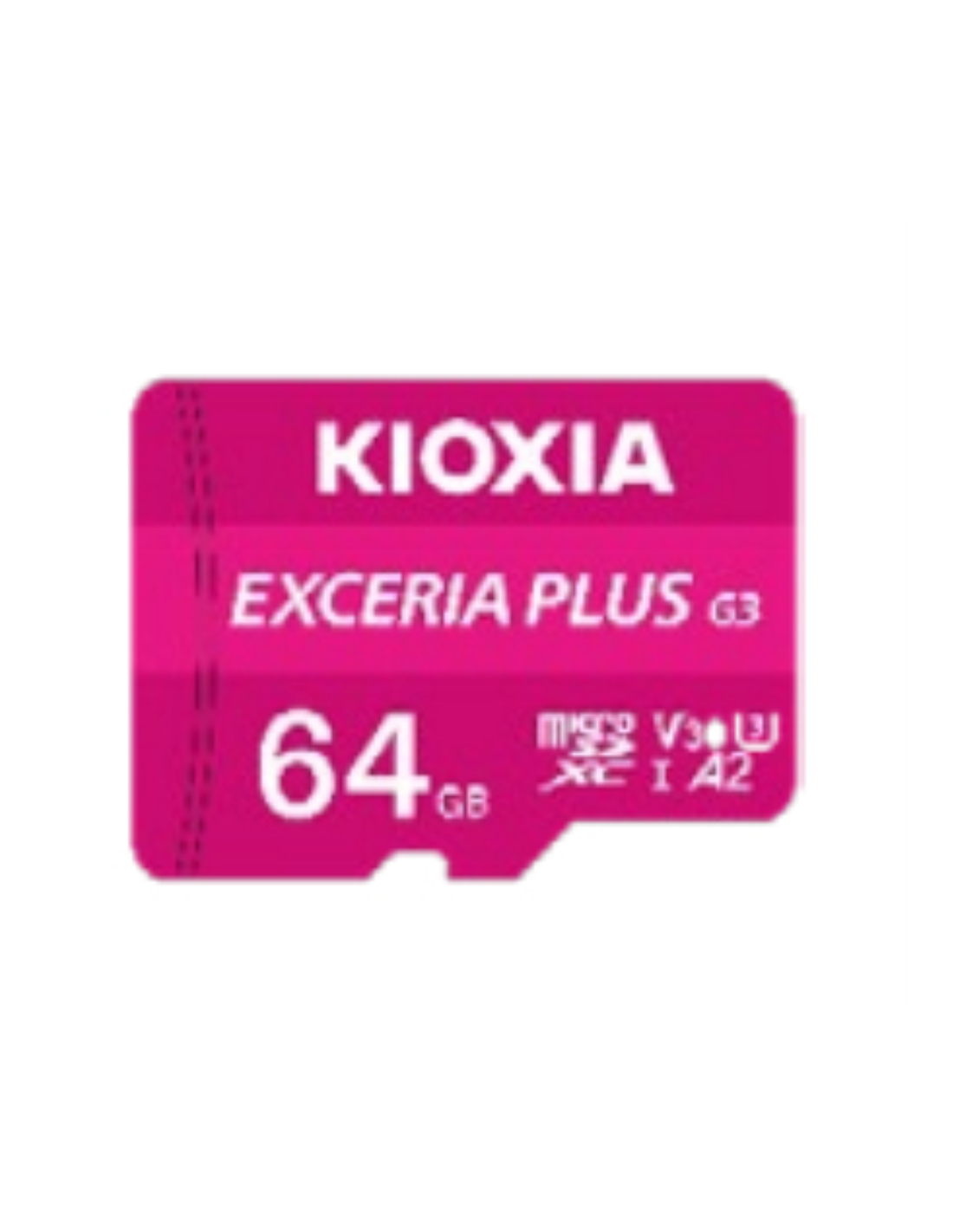 Kioxia EXCERIA PLUS G3. Capacidad: 64 GB, Tipo de tarjeta flash: MicroSDXC, Clase de memoria flash: Clase 10, Tipo de memoria interna: UHS-I, Velocidad de lectura: 210 MB/s, Velocidad de escritura: 90 MB/s, Clase de velocidad UHS: Class 3 (U3), Clase de velocidad de vídeo: V30. Funciones de protección: A prueba de golpes, Resistente al agua, Color del producto: Rosa