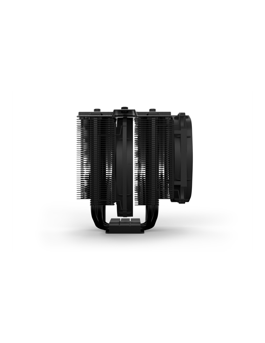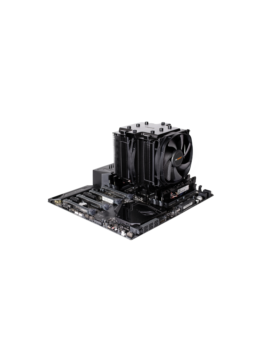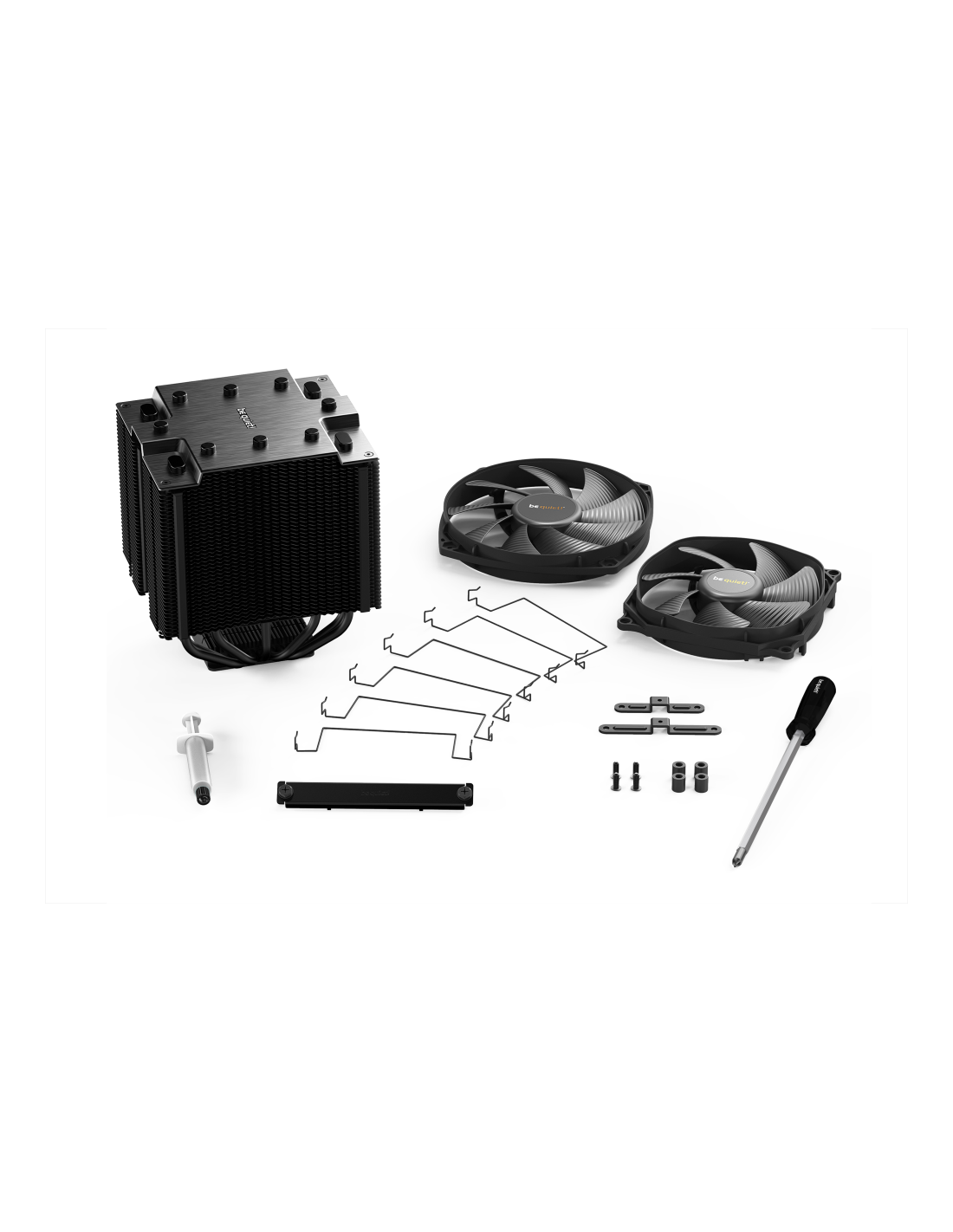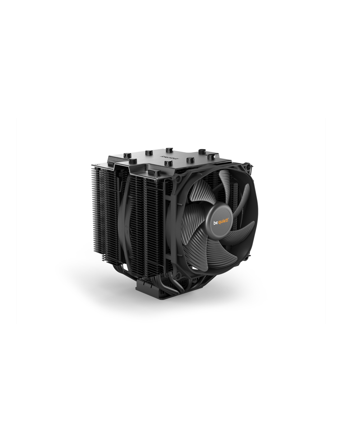 Los dos ventiladores Silent Wings PWM presentan avanzados soportes dinámicos con líquido, motores de 6 polos de marcha suave y aletas con flujo de aire optimizado. El ventilador frontal Silent Wings 3 ofrece una presión de aire extremadamente alta gracias a una entrada de aire en forma de embudo en el armazón. Montaje de ventilador desacoplado con elementos aislantes antivibración en el disipador térmico.