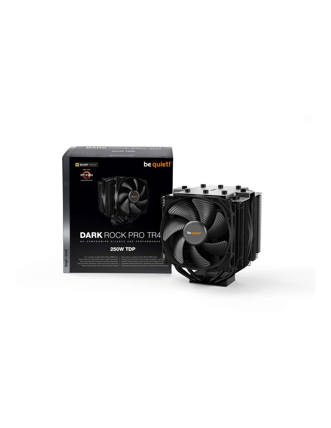 ¡Sin concesiones en cuanto a silencio y rendimiento para sistemas sobreacelerados y aplicaciones gráficas exigentes! Dark Rock Pro TR4 está diseñado solo para AMD TR4 y ofrece una impactante potencia de 250 W TDP.