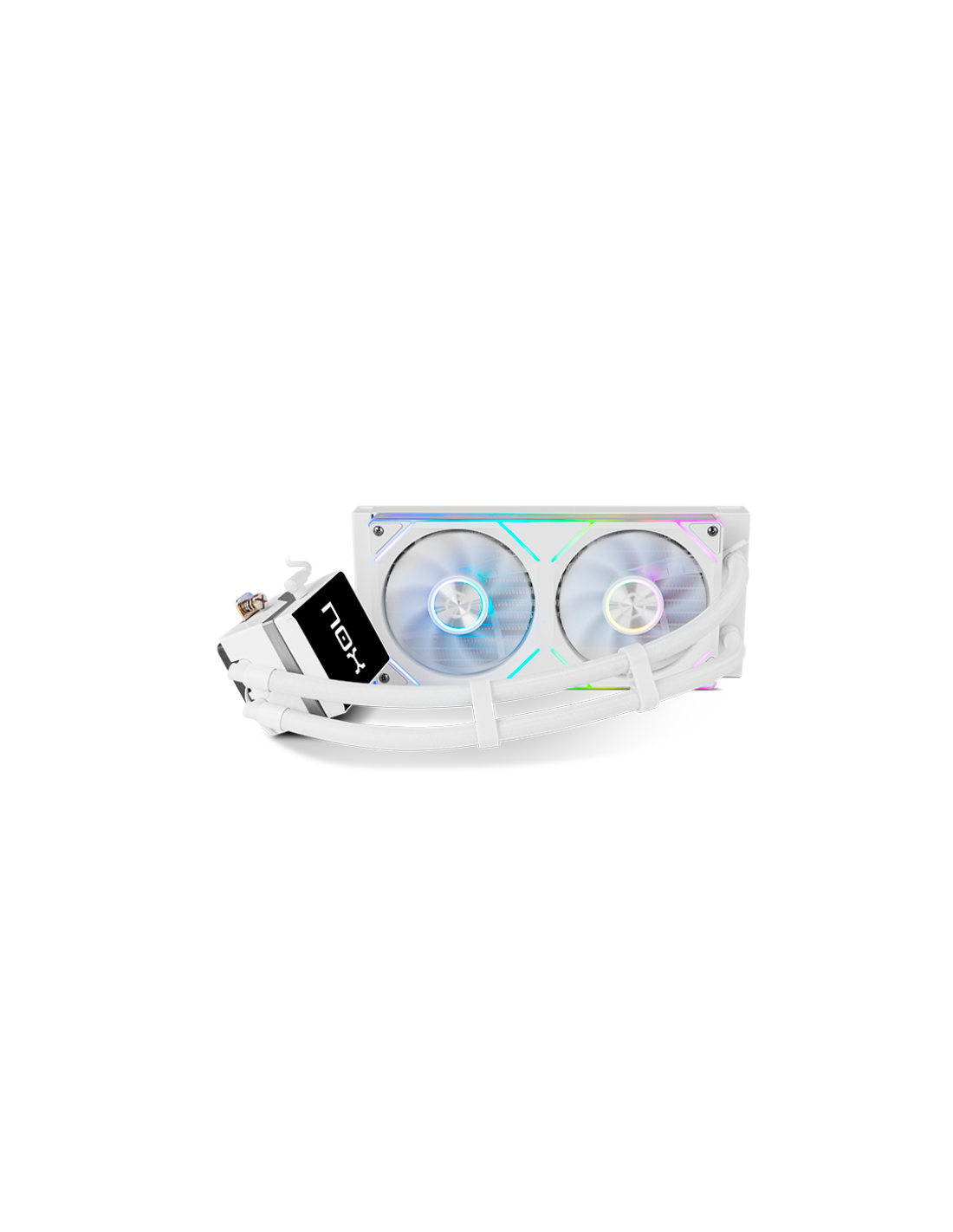 Disponible en color negro y blanco, este sistema de refrigeración líquida de Nox está compuesta por dos ventiladores con rodamiento hidraúlico, radiador de 240 mm y aletas aerodinámicas que facilitan la reducción de turbulencias entre radiador y ventilador.