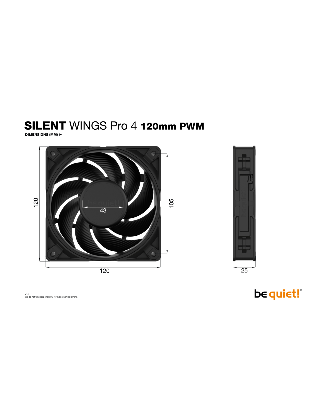 be quiet! SILENT WINGS PRO 4 | 120mm PWM. Tipo: Ventilador, Diámetro de ventilador: 12 cm, Velocidad de rotación (máx.): 3000 RPM, flujo de aire: 142,5 m³/h, Presión máxima de aire: 5,31 mmH2O, Tipo de soporte: Rodamiento dinámico fluido (FDB). Voltaje: 7 - 13.2 V. Ancho: 120 mm, Profundidad: 120 mm, Altura: 25 mm. Color del producto: Negro
