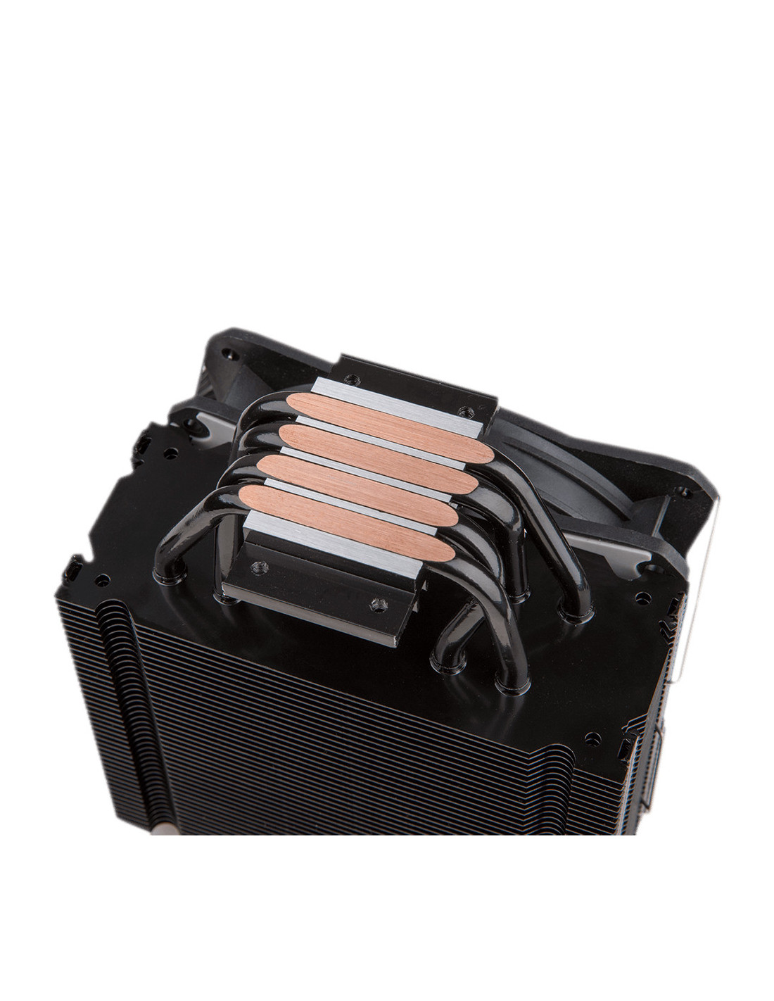 Dispone de 4 heatpipes de cobre de alto rendimiento con una excelente conductividad térmica, su base es de aluminio así como la columna central que da soporte y firmeza al heatsink.