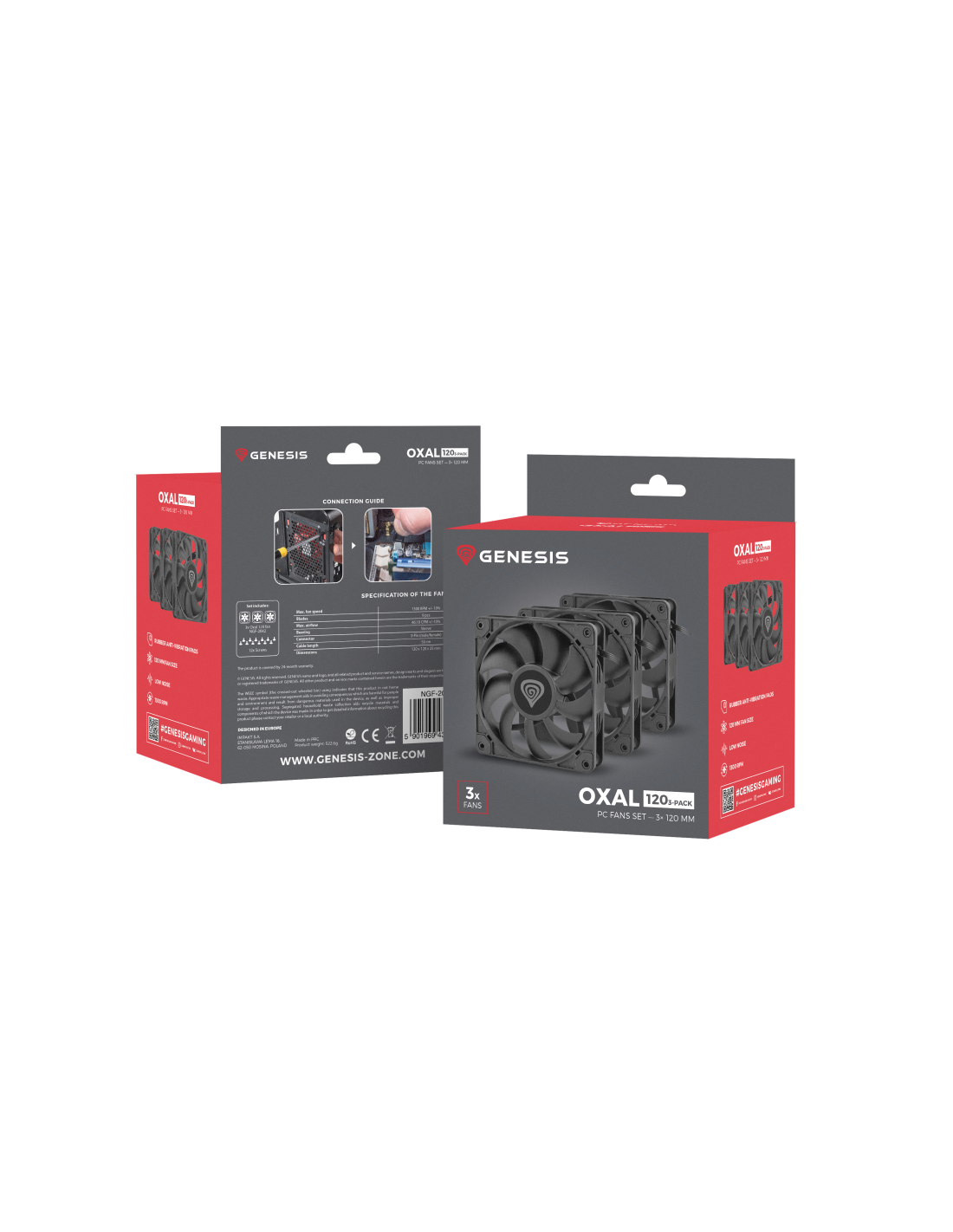 Mejore el rendimiento de refrigeración de su caja añadiendo hasta tres ventiladores Genesis Oxal 120 adicionales y note la diferencia. El pack de 3 ventiladores Genesis Oxal 120 también puede ayudarte a liberar todo el potencial de tu caja. Si tiene una Genesis Irid 505 V2 o Irid 503 V2, crear una configuración de cinco ventiladores es fácil.