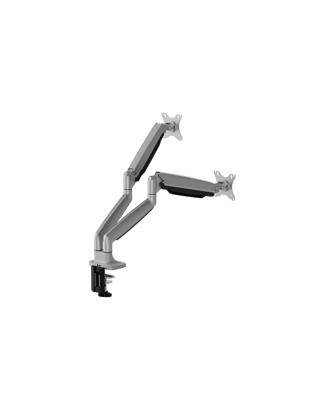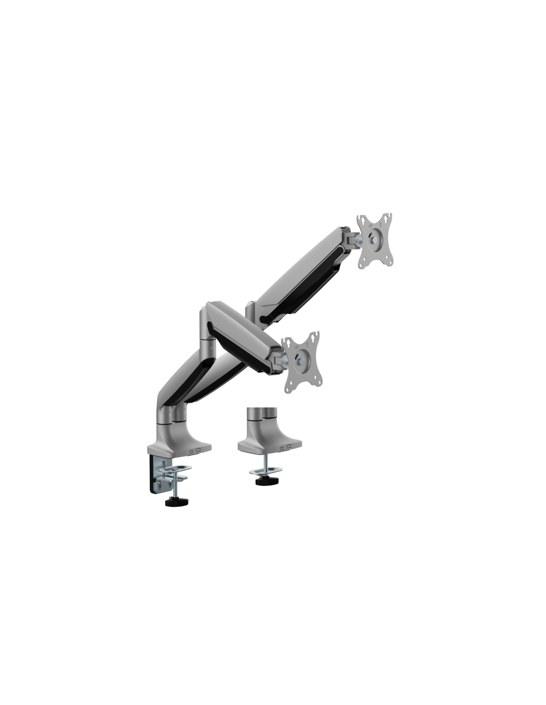 Mejora tu estación de trabajo con nuestro robusto soporte de escritorio para doble monitor, diseñado para acomodar monitores planos, curvos y ultra-ancho de hasta 45 pulgadas y 15 kg. Este soporte para doble monitor combina versatilidad, ajuste ergonómico y un diseño elegante y organizado, lo que lo hace perfecto para cualquier configuración profesional o de juego.