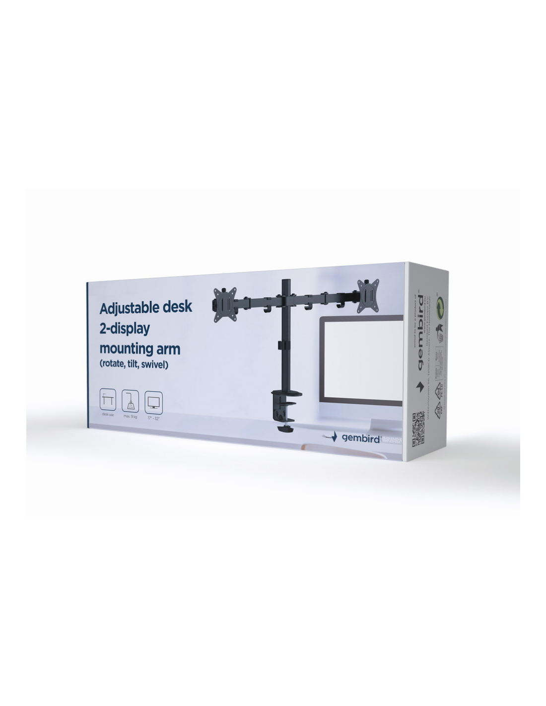 Gembird MA-D2-01. Montaje: Abrazadera, Capacidad máxima de peso: 18 kg, Tamaño mínimo de pantalla: 43,2 cm (17"), Tamaño máximo de pantalla: 81,3 cm (32"), Compatibilidad con interfaz de montaje (min): 75 x 75 mm, Compatibilidad con interfaz de montaje (max): 100 x 100 mm. Ángulo de giro (alcance): -90 - 90°, Ángulo de inclinación: -45 - 45°. Color del producto: Negro