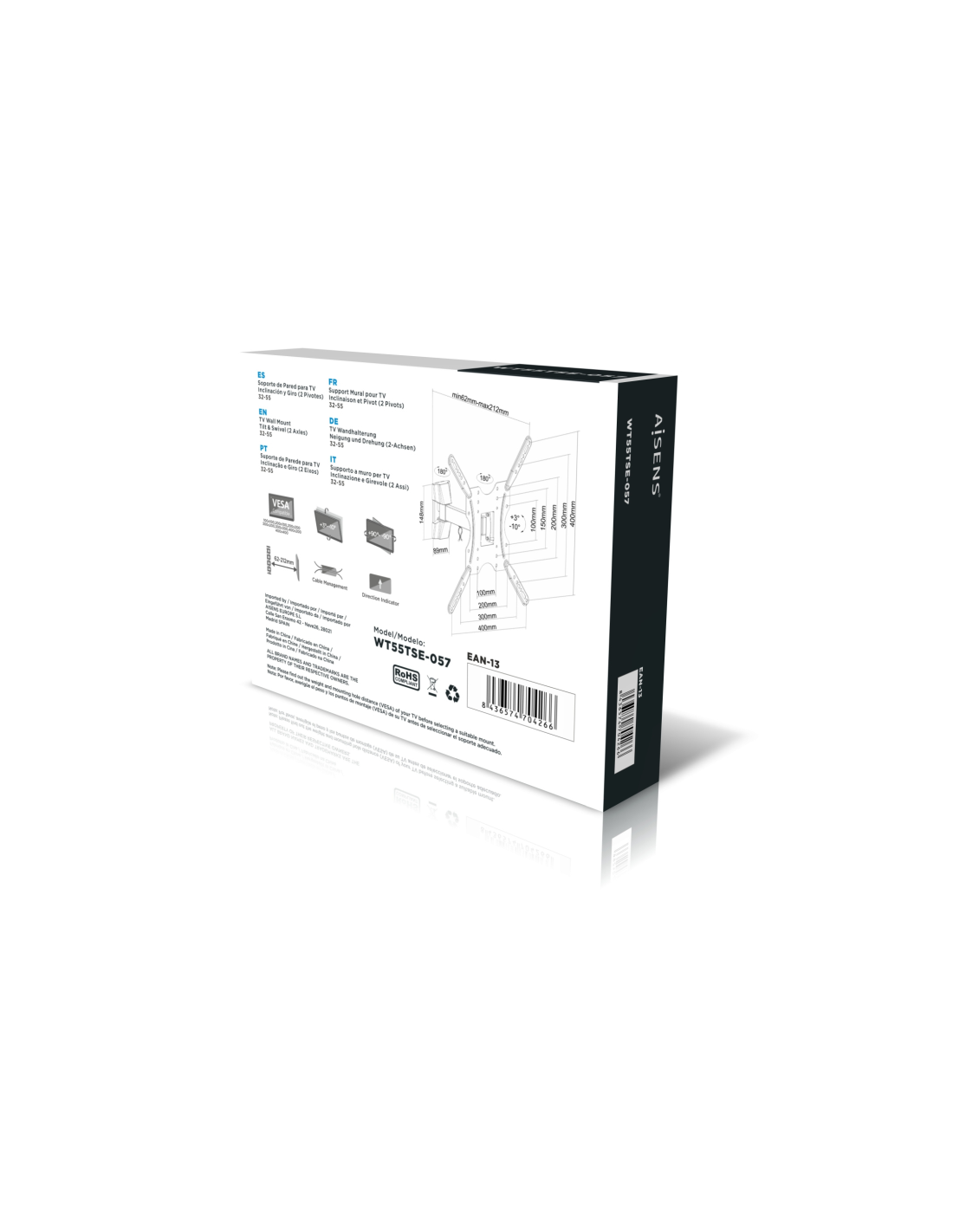 AISENS Soporte ECO giratorio, inclinable para monitor/TV 30kg (2 Pivotes) de 32-55, Negro. Montaje: Tornillos, Capacidad máxima de peso: 30 kg, Tamaño mínimo de pantalla: 81,3 cm (32"), Tamaño máximo de pantalla: 139,7 cm (55"), Compatibilidad con interfaz de montaje (min): 100 x 100 mm, Compatibilidad con interfaz de montaje (max): 400 x 400 mm. Ángulo de inclinación: -10 - 3°. Color del producto: Negro