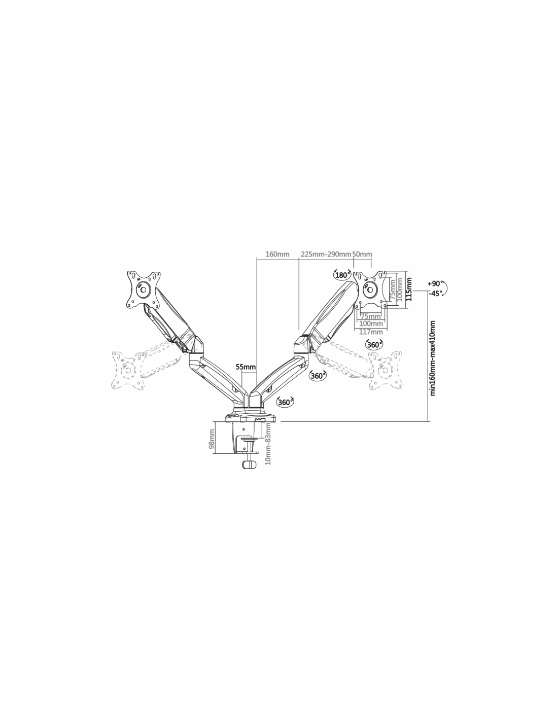 Una vez ajustados los brazos a la fuerza correcta, puede ajustar la altura de las pantallas subiéndolas o bajándolas con las manos y las pantallas se quedarán en la posición deseada.