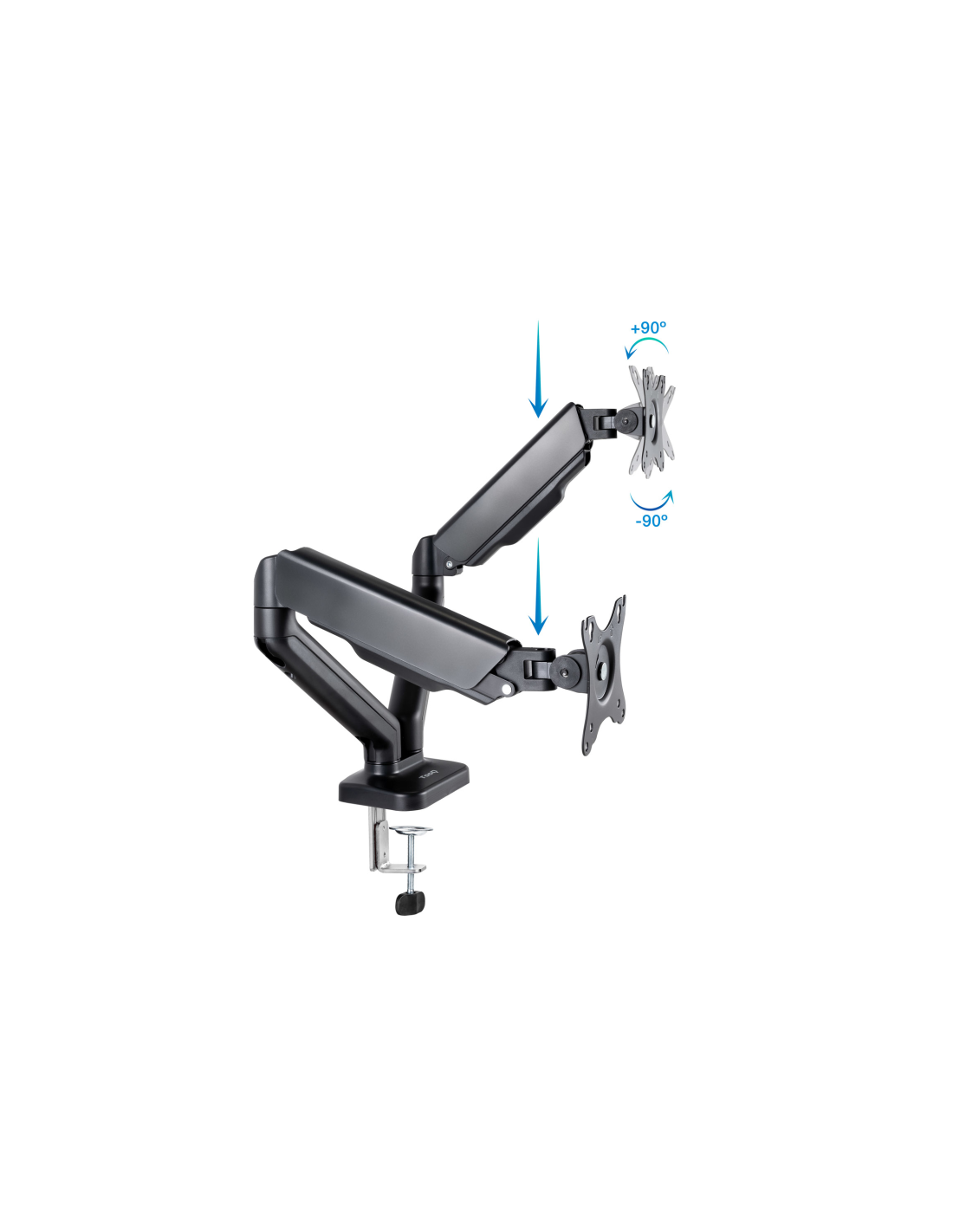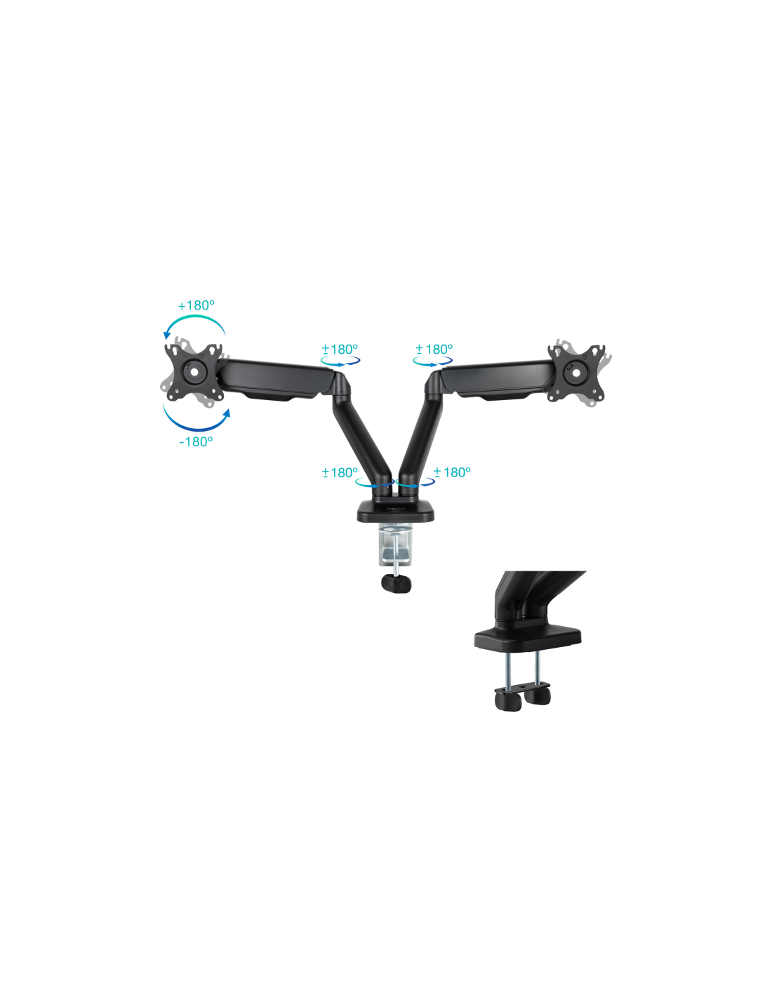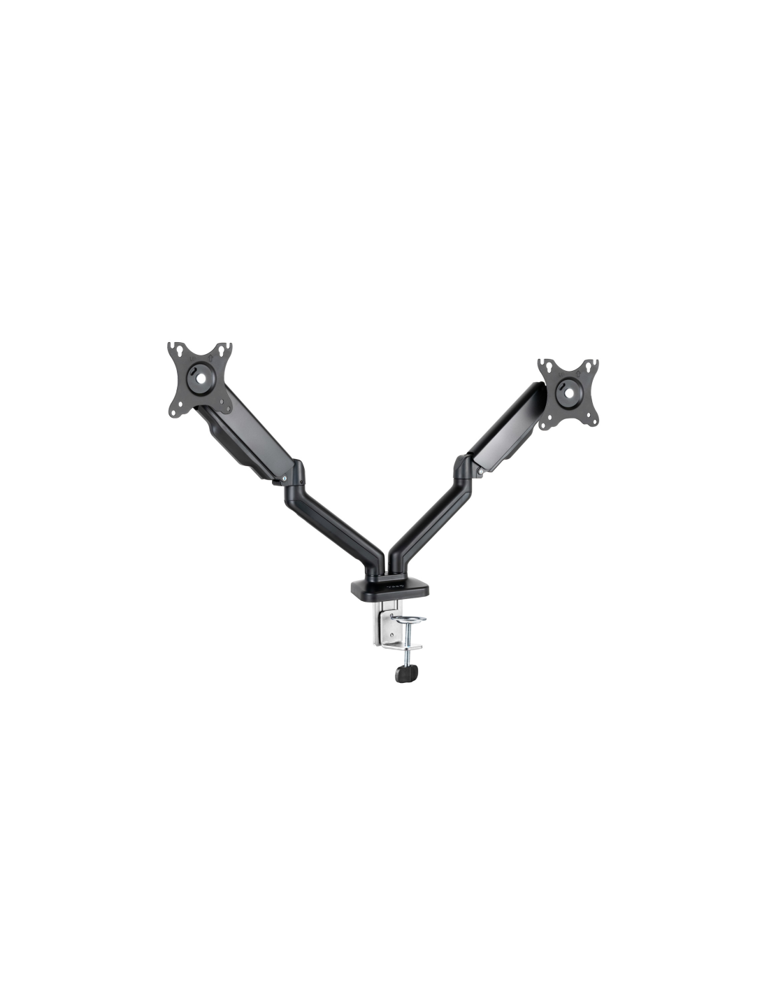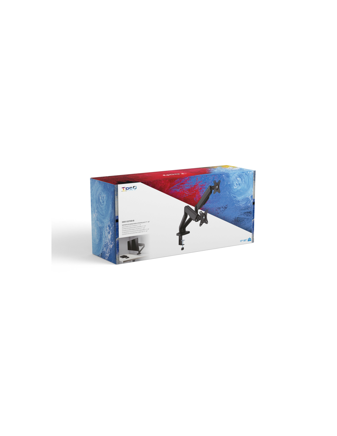 TooQ Soporte de Mesa para 2 Pantallas 17"-32", Negro. Montaje: Abrazadera/Atornillado, Capacidad máxima de peso: 9 kg, Tamaño mínimo de pantalla: 43,2 cm (17"), Tamaño máximo de pantalla: 81,3 cm (32"), Compatibilidad con interfaz de montaje (min): 75 x 75 mm, Compatibilidad con interfaz de montaje (max): 100 x 100 mm. Ajustes de altura, Ángulo de giro (alcance): -90 - 90°, Ángulo de inclinación: -90 - 90°. Color del producto: Negro