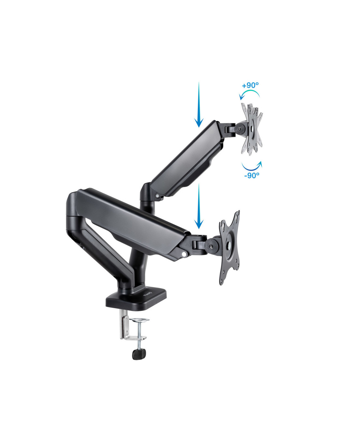 ¡Doble o nada! Nuestro soporte perfecto para tus dos pantallas. Ideal para gamers o para trabajar más cómodamente. Cuenta con sistema de organización de cables y además es compatible con pantallas curvas.