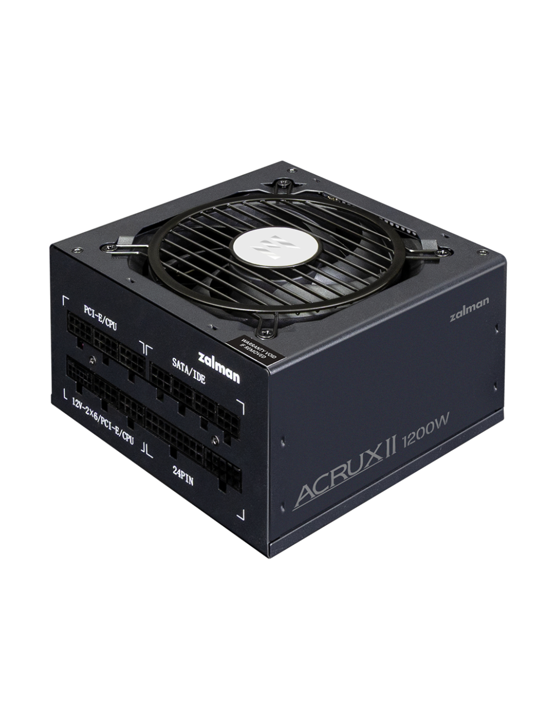 Zalman ACRUX II. Potencia total: 1200 W, Voltaje de entrada AC: 100 - 240 V, Frecuencia de entrada AC: 50/60 Hz. Alimentador de energía para tarjeta madre: 24-pin ATX, Longitud del cable de alimentación de la placa base: 60 cm, Longitud del cable de alimentación SATA: 500 mm. Utilizar con: PC, Factor de forma de fuente de alimentación (PSU): ATX, Certificación 80 PLUS: 80 PLUS Platinum. Color del producto: Negro, Diámetro de ventilador: 12 cm. Certificados de conformidad: CE, CB, RoHS, EAC, cTUVus, RCM, Com