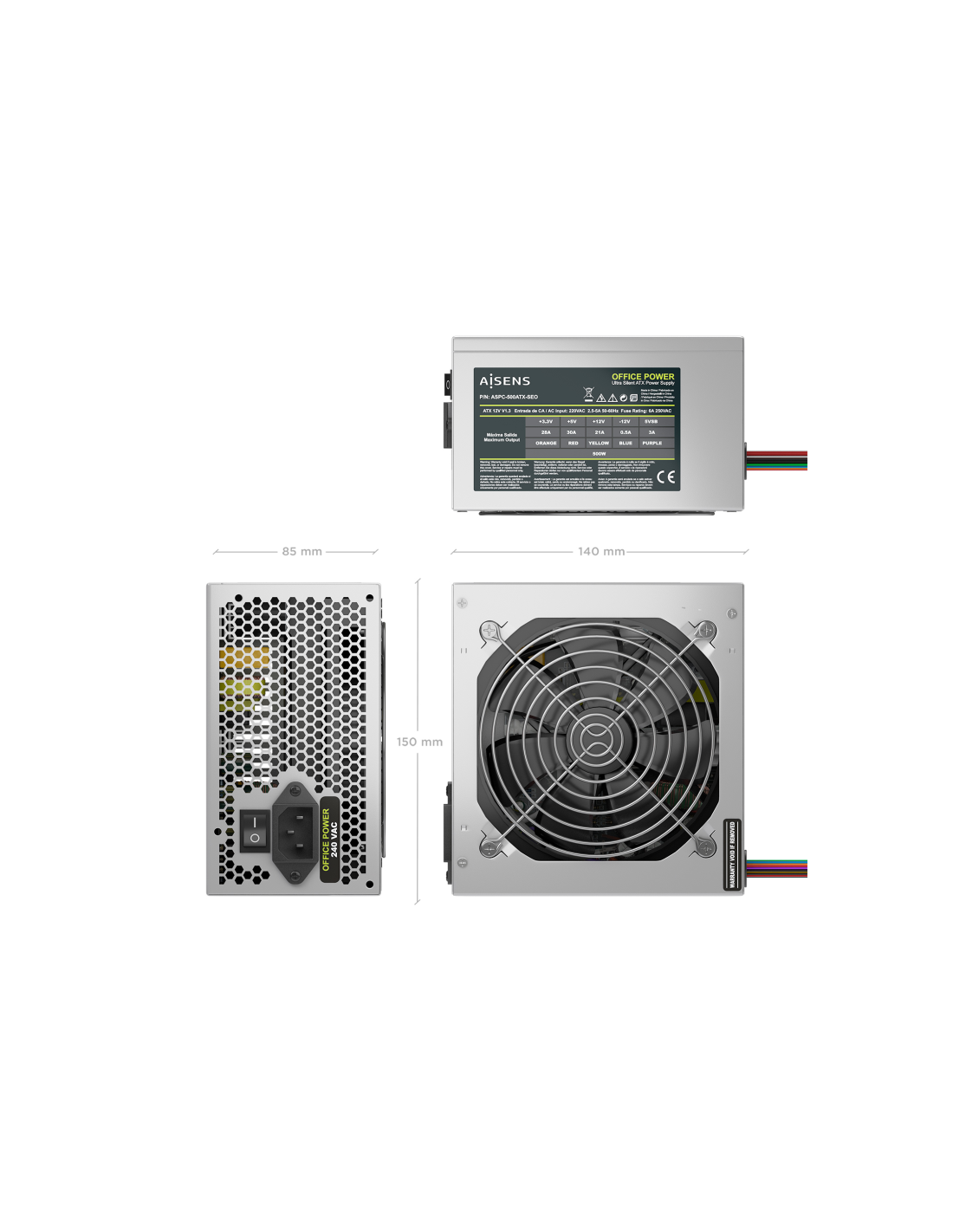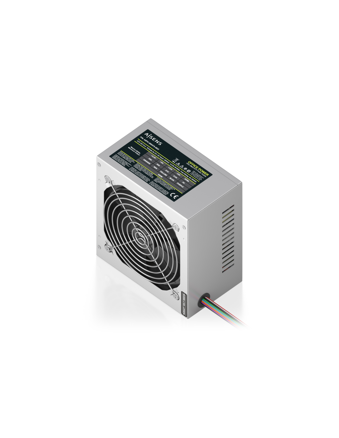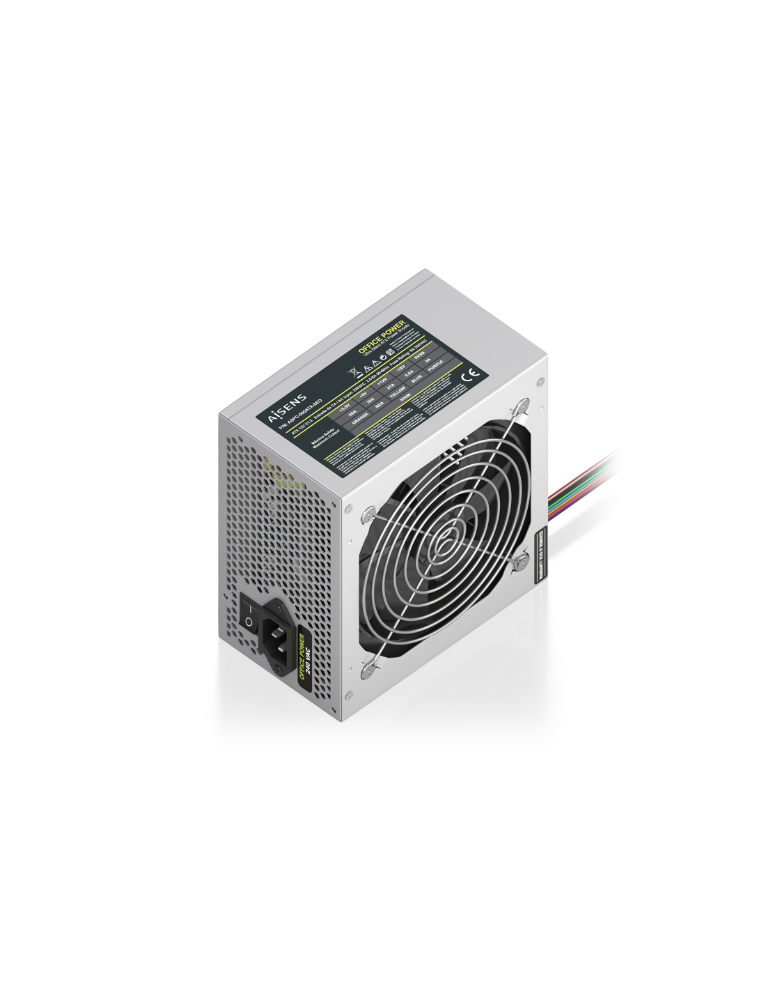 AISENS Fuente Alimentacion ATX 500W OEM, Plata. Potencia total: 500 W, Voltaje de entrada AC: 220 V, Frecuencia de entrada AC: 50/60 Hz. Alimentador de energía para tarjeta madre: 20+4 pin ATX, Longitud del cable de alimentación de la placa base: 35 cm, Longitud del cable de alimentación SATA: 350,500 mm. Utilizar con: PC, Factor de forma de fuente de alimentación (PSU): ATX. Color del producto: Plata, Tipo de enfriamiento: Activo, Diámetro de ventilador: 12 cm. Certificados de conformidad: CE, RoHS