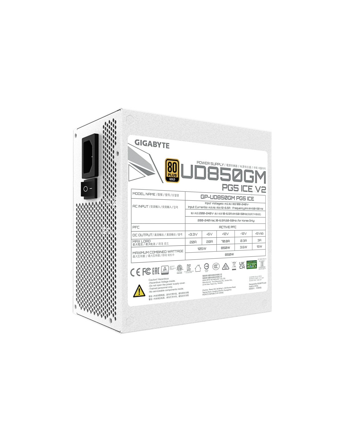 GIGABYTE UD850GM PG5 V2 ICE Fuente de Alimentación – PCIe Gen 5.1, 80 PLUS Gold, Diseño completamente modular, Ventilador de 120 mm, Compatible con ATX 3.1, Enchufe EU. Potencia total: 850 W, Voltaje de entrada AC: 100 - 240 V, Frecuencia de entrada AC: 50/60 Hz. Alimentador de energía para tarjeta madre: 20+4 pin ATX, Longitud del cable de alimentación de la placa base: 61 cm, Longitud del cable de alimentación SATA: 150,600 mm. Utilizar con: PC, Factor de forma de fuente de alimentación (PSU): ATX, Certif