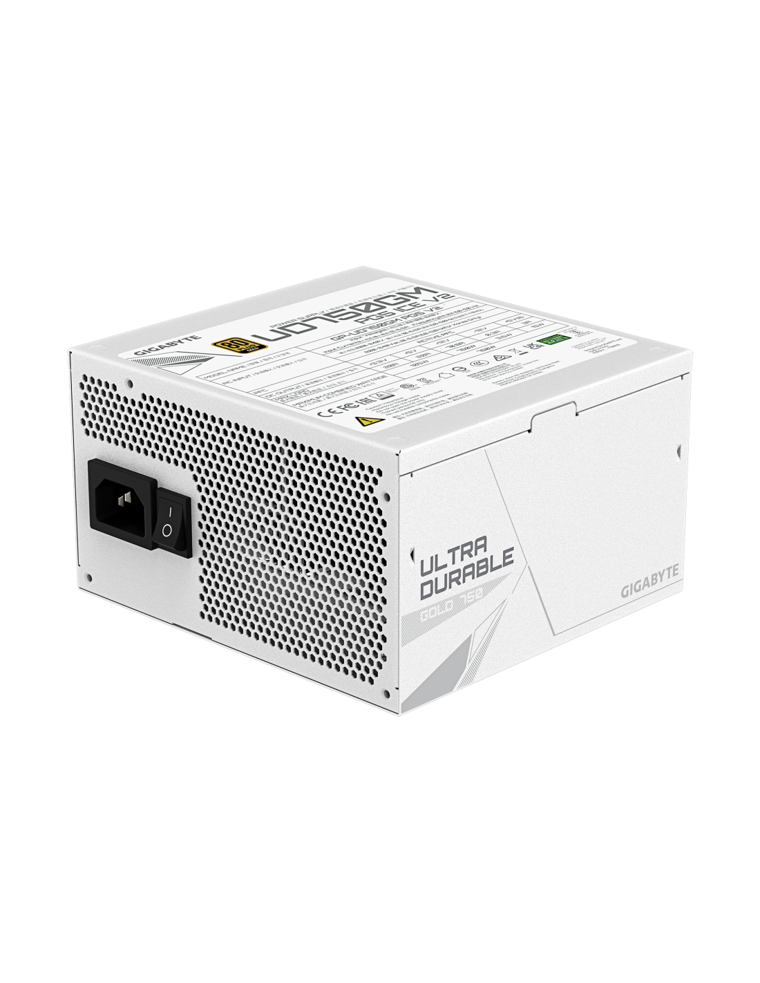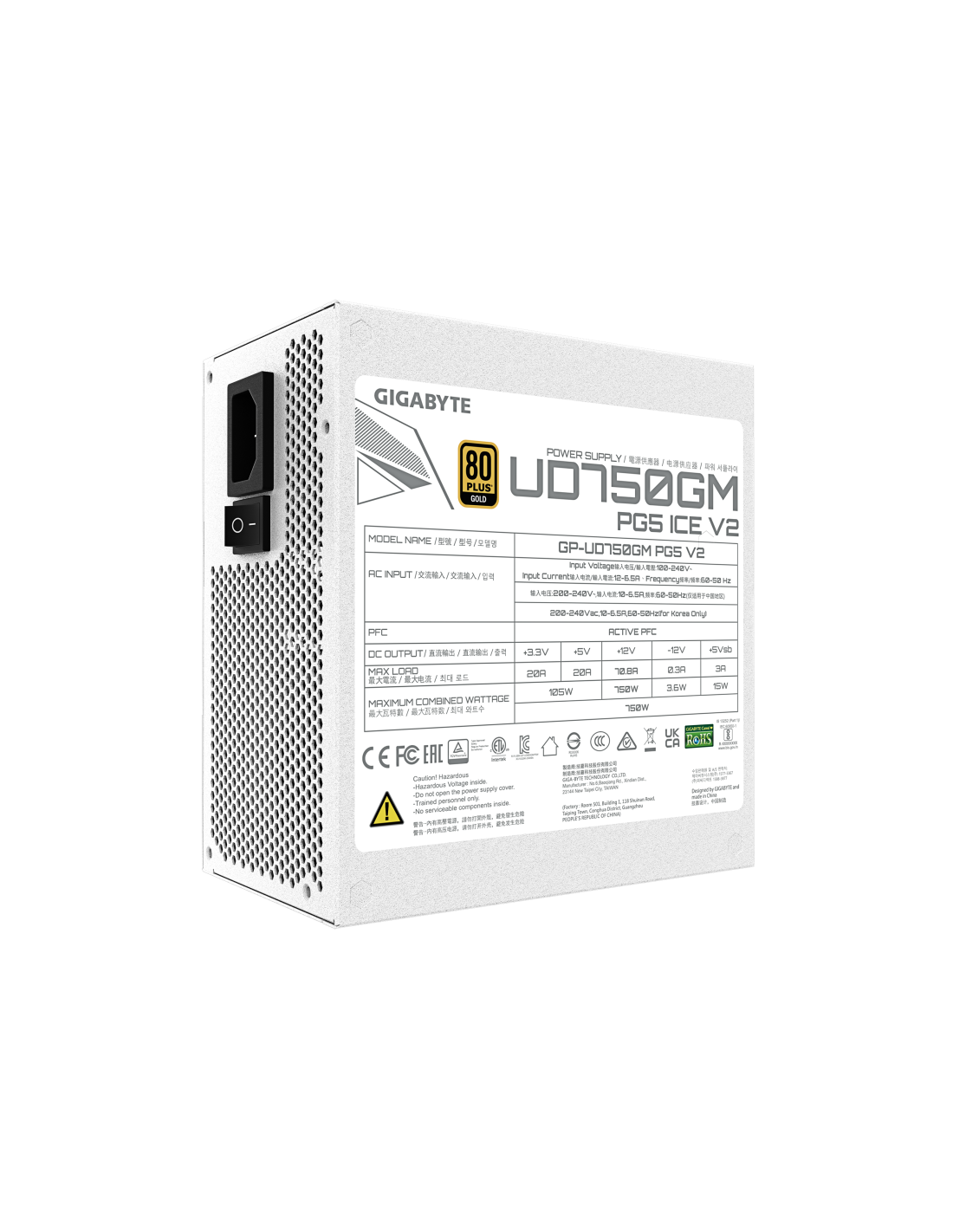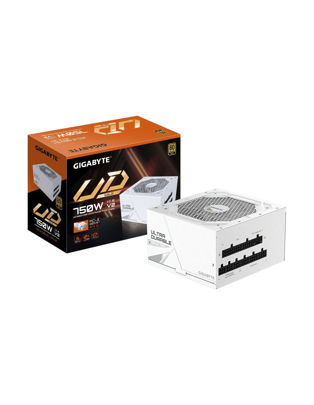 GIGABYTE UD750GM PG5 V2 ICE Fuente de Alimentación – PCIe Gen 5.1, 80 PLUS Gold, Diseño completamente modular, Ventilador de 120 mm, Compatible con ATX 3.1, Enchufe EU. Potencia total: 750 W, Voltaje de entrada AC: 100 - 240 V, Frecuencia de entrada AC: 50/60 Hz. Alimentador de energía para tarjeta madre: 20+4 pin ATX, Longitud del cable de alimentación de la placa base: 61 cm, Longitud del cable de conectores de alimentación PCI Express (12+4 pines): 700 mm. Utilizar con: PC, Factor de forma de fuente de a