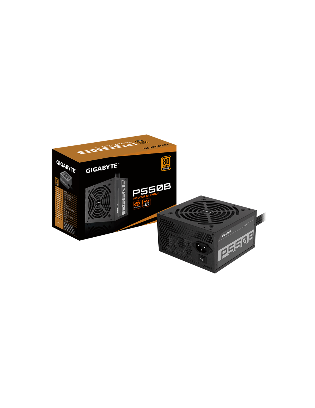 GIGABYTE P550B. Potencia total: 550 W, Voltaje de entrada AC: 100 - 240 V, Frecuencia de entrada AC: 50 - 60 Hz. Alimentador de energía para tarjeta madre: 20+4 pin ATX, Longitud del cable de alimentación de la placa base: 55 cm, Longitud del cable de alimentación SATA: 500 mm. Utilizar con: PC, Factor de forma de fuente de alimentación (PSU): ATX, Certificación 80 PLUS: 80 PLUS Bronze. Color del producto: Negro, Tipo de enfriamiento: Activo, Diámetro de ventilador: 12 cm. Ancho: 150 mm, Profundidad: 140 mm