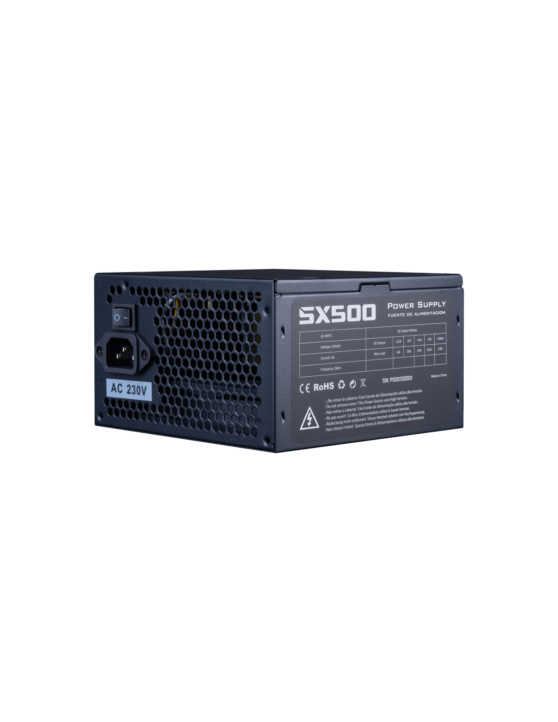 Hiditec PSX500 Bulk. Potencia total: 500 W, Voltaje de entrada AC: 230 V, Frecuencia de entrada AC: 50/60 Hz. Alimentador de energía para tarjeta madre: 20+4 pin ATX, Tipo de cableado: No modular. Utilizar con: PC, Factor de forma de fuente de alimentación (PSU): ATX, Formas de factor de tarjeta madre soportadas: ATX. Color del producto: Negro, Diámetro de ventilador: 12 cm, Número de ventiladores: 1 Ventilador(es). Certificados de conformidad: CE, Comisión Federal de Comunicaciones (FCC) de Estados Unidos,