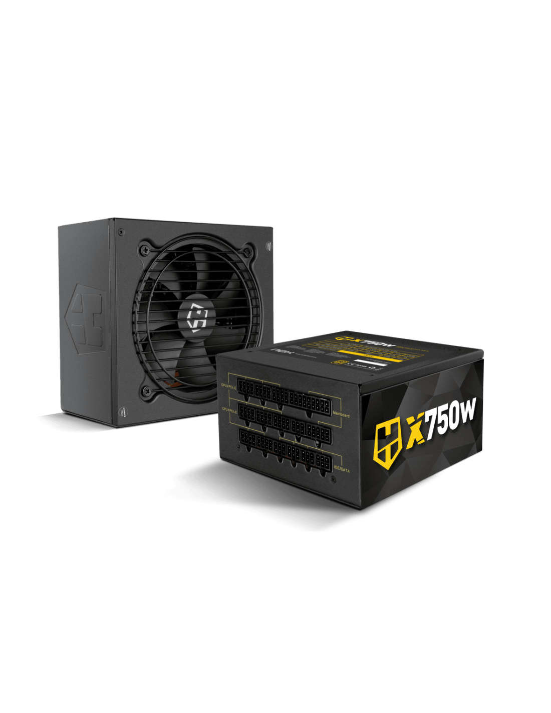 NOX Hummer X750W. Potencia total: 750 W, Voltaje de entrada AC: 100 - 240 V, Frecuencia de entrada AC: 47 - 63 Hz. Alimentador de energía para tarjeta madre: 24-pin ATX, Longitud del cable de alimentación de la placa base: 60 cm, Longitud del cable de alimentación PCI Express: 56 cm. Utilizar con: PC, Factor de forma de fuente de alimentación (PSU): ATX, Certificación 80 PLUS: 80 PLUS Gold. Color del producto: Negro, Tipo de enfriamiento: Activo, Diámetro de ventilador: 12 cm. Cables incluidos: PCIe, SATA
