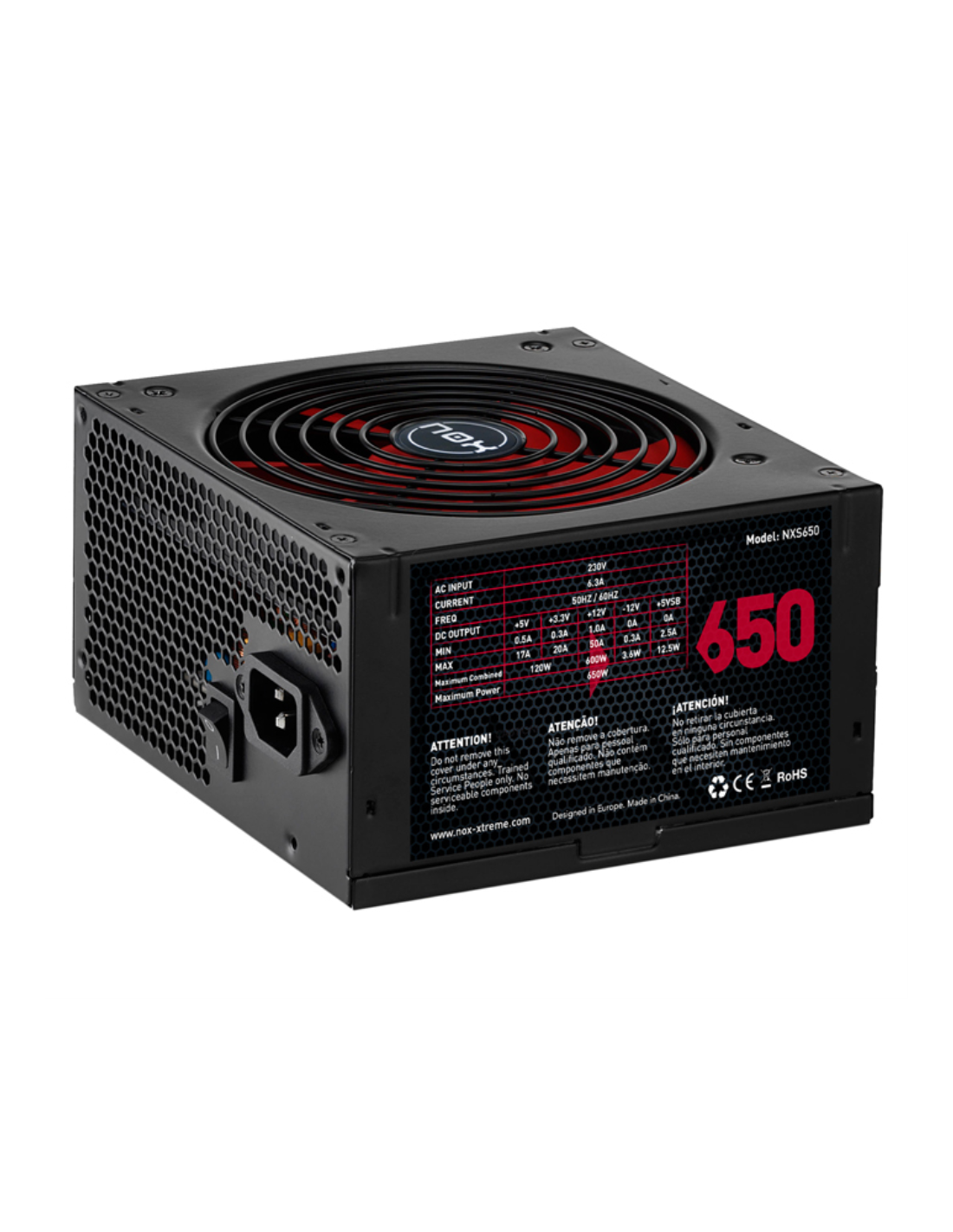 NOX NXS650. Potencia total: 650 W, Voltaje de entrada AC: 230 V, Frecuencia de entrada AC: 50 - 60 Hz. Alimentador de energía para tarjeta madre: 20+4 pin ATX, Tipo de cableado: No modular. Utilizar con: PC. Color del producto: Negro, Rojo, Tipo de enfriamiento: Activo, Diámetro de ventilador: 14 cm. Ancho: 150 mm, Profundidad: 160 mm, Altura: 86 mm