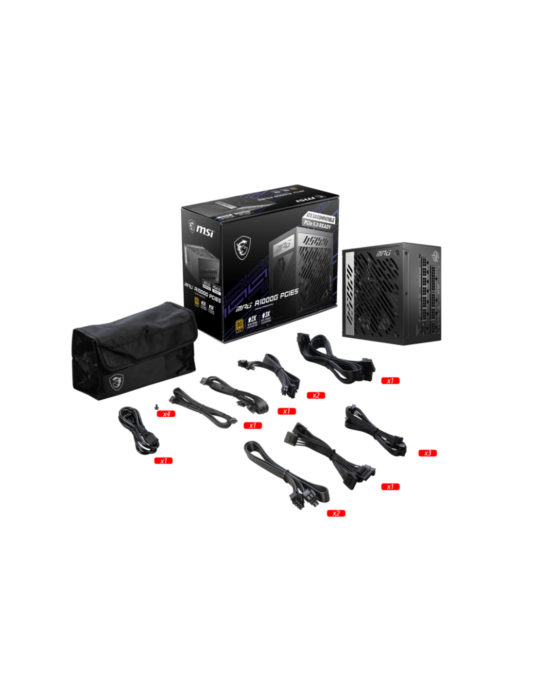 MSI MPG A1000G PCIE5. Potencia total: 1000 W, Voltaje de entrada AC: 100 - 240 V, Frecuencia de entrada AC: 50 - 60 Hz. Alimentador de energía para tarjeta madre: 20+4 pin ATX, Longitud del cable de alimentación de la placa base: 60 cm, Longitud del cable de alimentación SATA: 500,650,700,850 mm. Utilizar con: PC/servidor, Factor de forma de fuente de alimentación (PSU): ATX, Certificación 80 PLUS: 80 PLUS Gold. Color del producto: Negro, Tipo de enfriamiento: Activo, Diámetro de ventilador: 13,5 cm. Ancho: