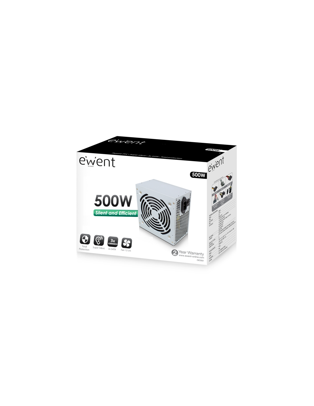 Ewent EW3909. Potencia total: 500 W, Voltaje de entrada AC: 160 - 270 V, Corriente máxima de salida (+3.3V): 6 A. Alimentador de energía para tarjeta madre: 20+4 pin ATX, Longitud del cable de alimentación de la placa base: 40 cm, Longitud del cable de alimentación SATA: 400 mm. Utilizar con: PC, Factor de forma de fuente de alimentación (PSU): ATX. Color del producto: Gris, Tipo de enfriamiento: Activo, Diámetro de ventilador: 12 cm. Certificados de conformidad: CE, REACH, Certificación: IEC62321:2013 EN 5