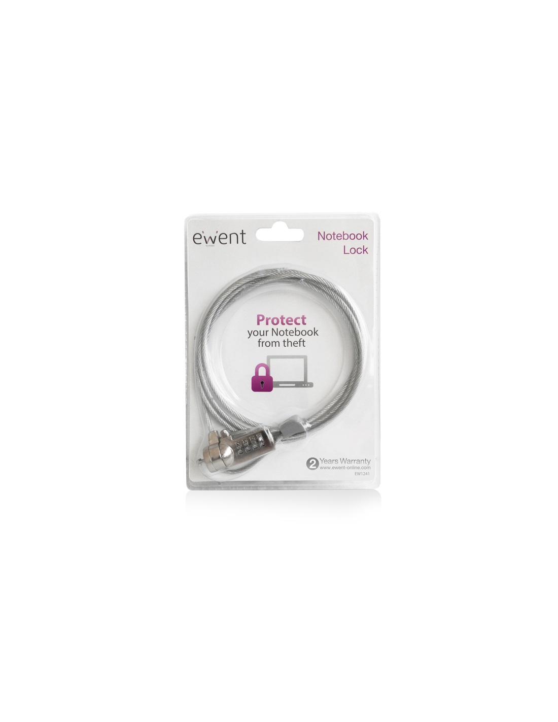 El Candado para Portátil EW1241 protege su ordenador portátil y su escritorio contra robos. Funciona como un candado para bicicletas. Simplemente enrolle el cable de acero de 1,5 metros alrededor de un objeto inamovible, como una pared, un radiador o un escritorio; y para terminar, introduzca una combinación de números para activar el bloqueo.