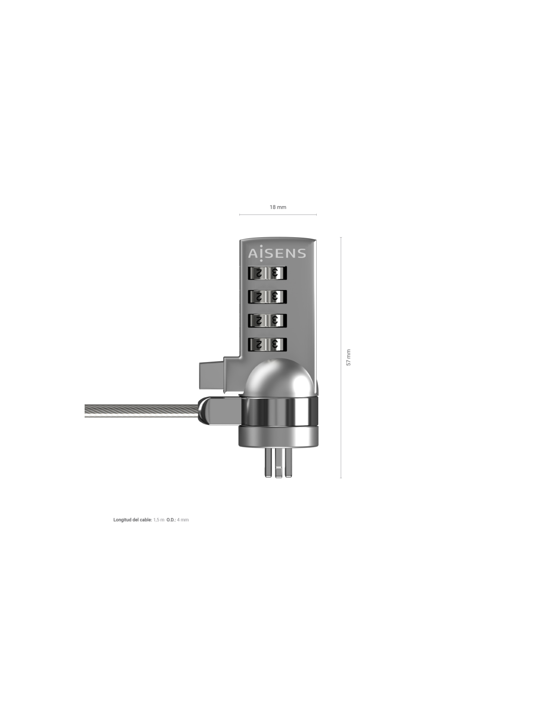 AISENS Cable de Seguridad con Cerradura de Combinacion para Ordenador, Monitor, Portatil 1.5M. Color del producto: Plata, Mejores usos: Monitor, Portátil, PC, Tipo de candado: Cerradura con combinación. Longitud de cable: 1,5 m, Diámetro de cable: 4 mm, Ancho: 57 mm. Cantidad por paquete: 1 pieza(s), Ancho del paquete: 153 mm, Profundidad del paquete: 25 mm. Ancho de la caja principal: 350 mm, Longitud de la caja: 525 mm, Alto de la caja principal: 450 mm