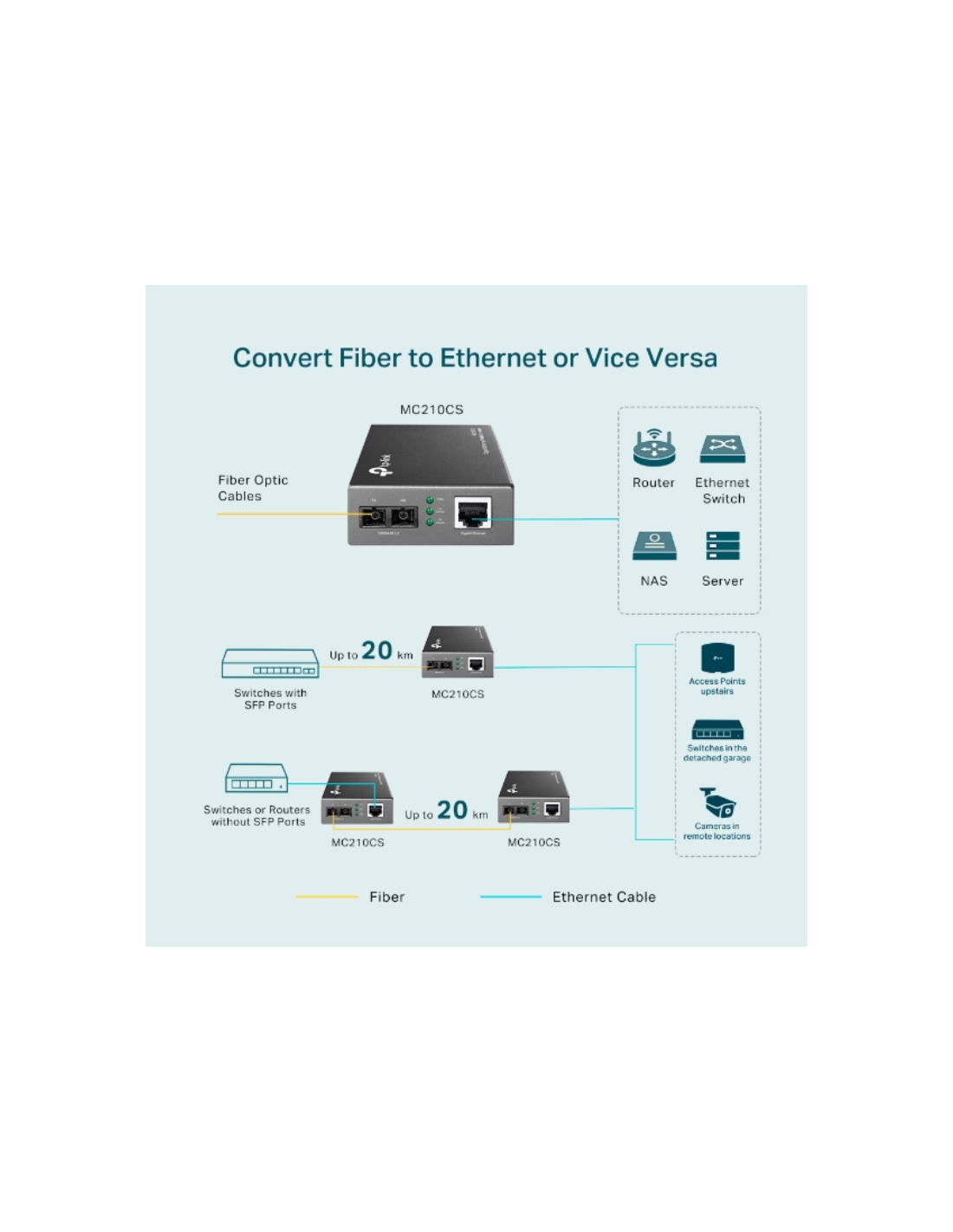 El MC210CS soporta láser de onda corta (SX) a una tasa de transferencia de velocidad completa de cable.