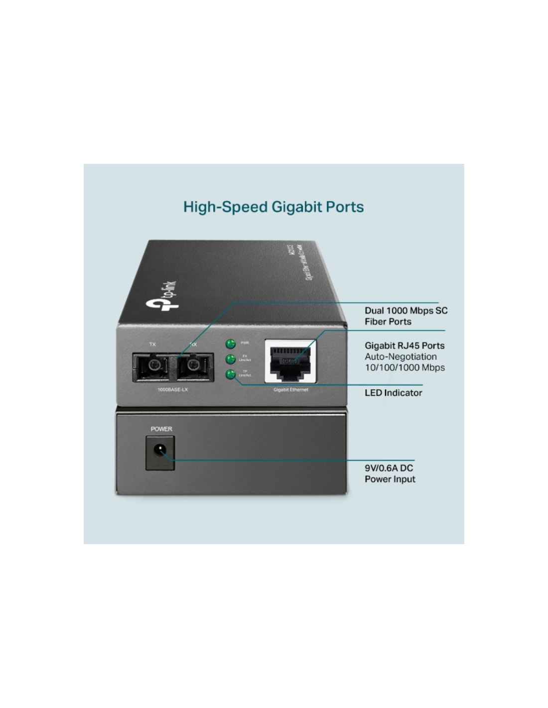 Otras características de este módulo son la posibilidad de uso como dispositivo independiente (sin necesidad de bastidor) o con el bastidor del sistema de 19” de TP-LINK’s, Auto MDI/MDI-X para el puerto TX y LEDs de estado en el panel frontal.