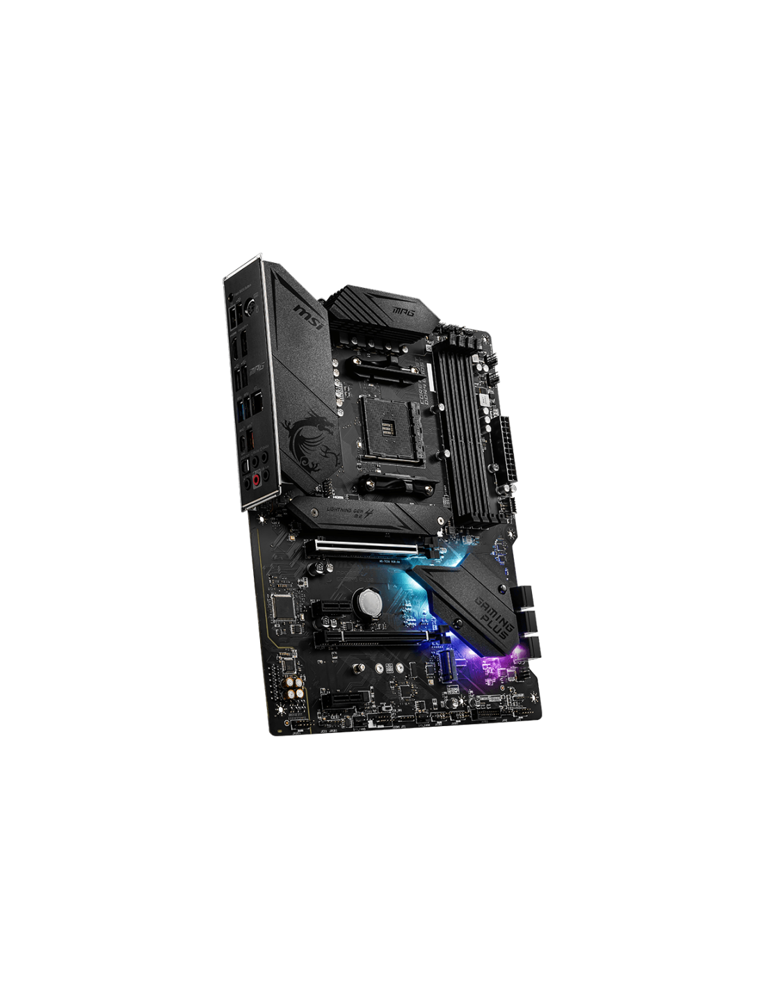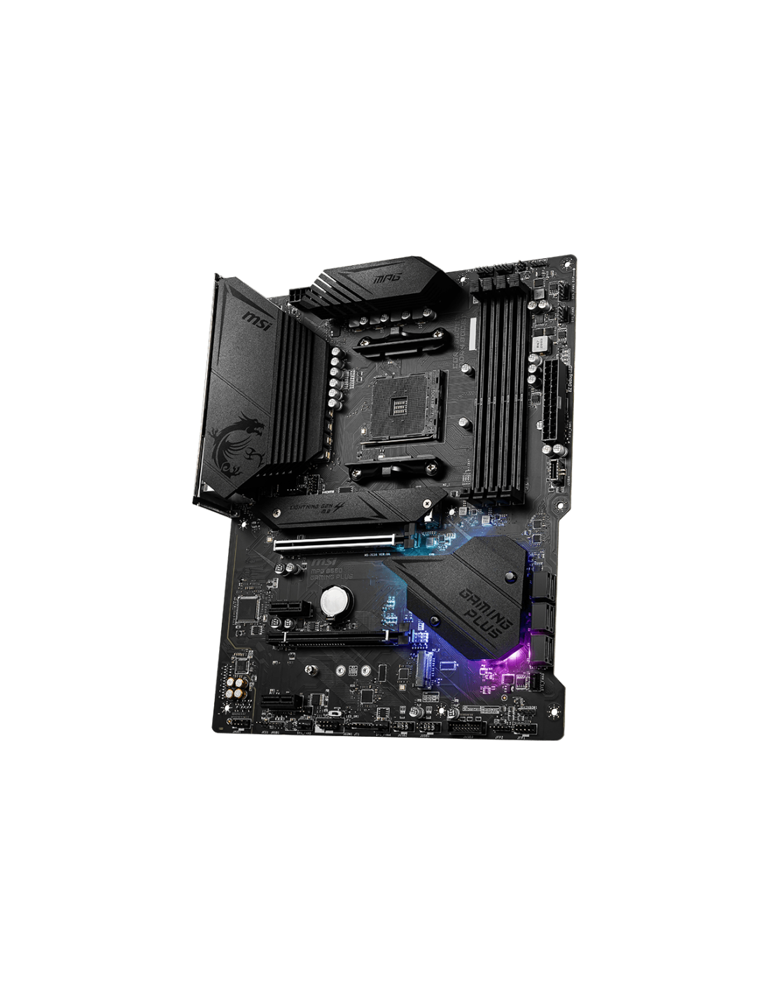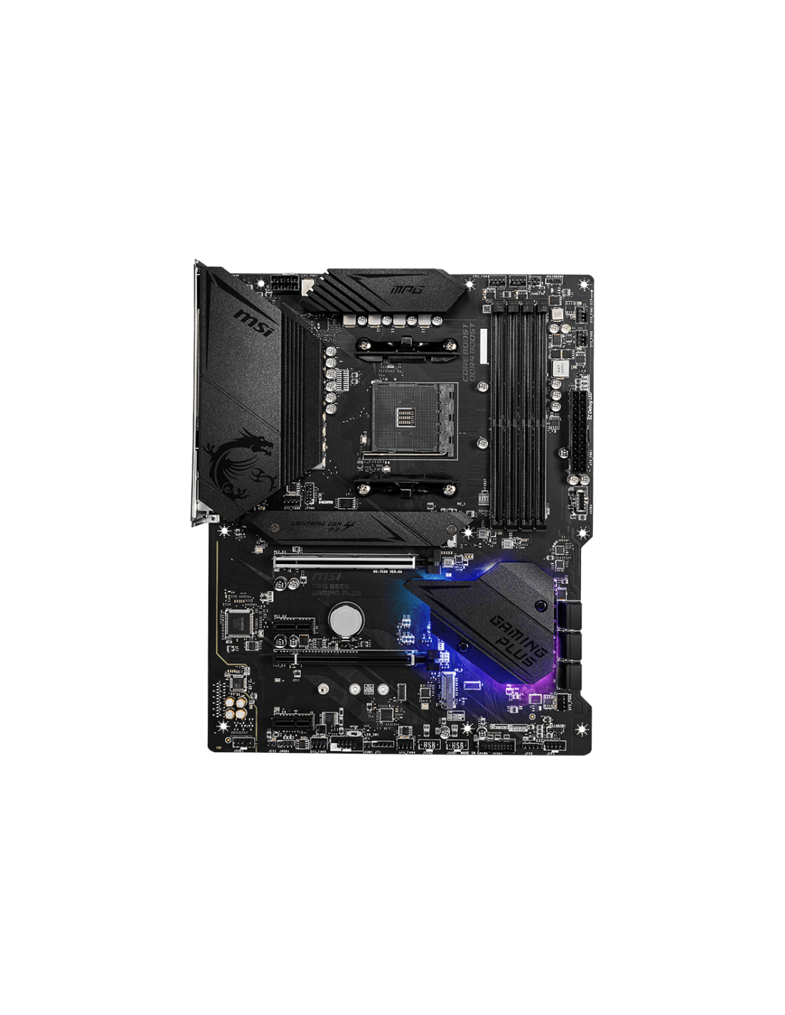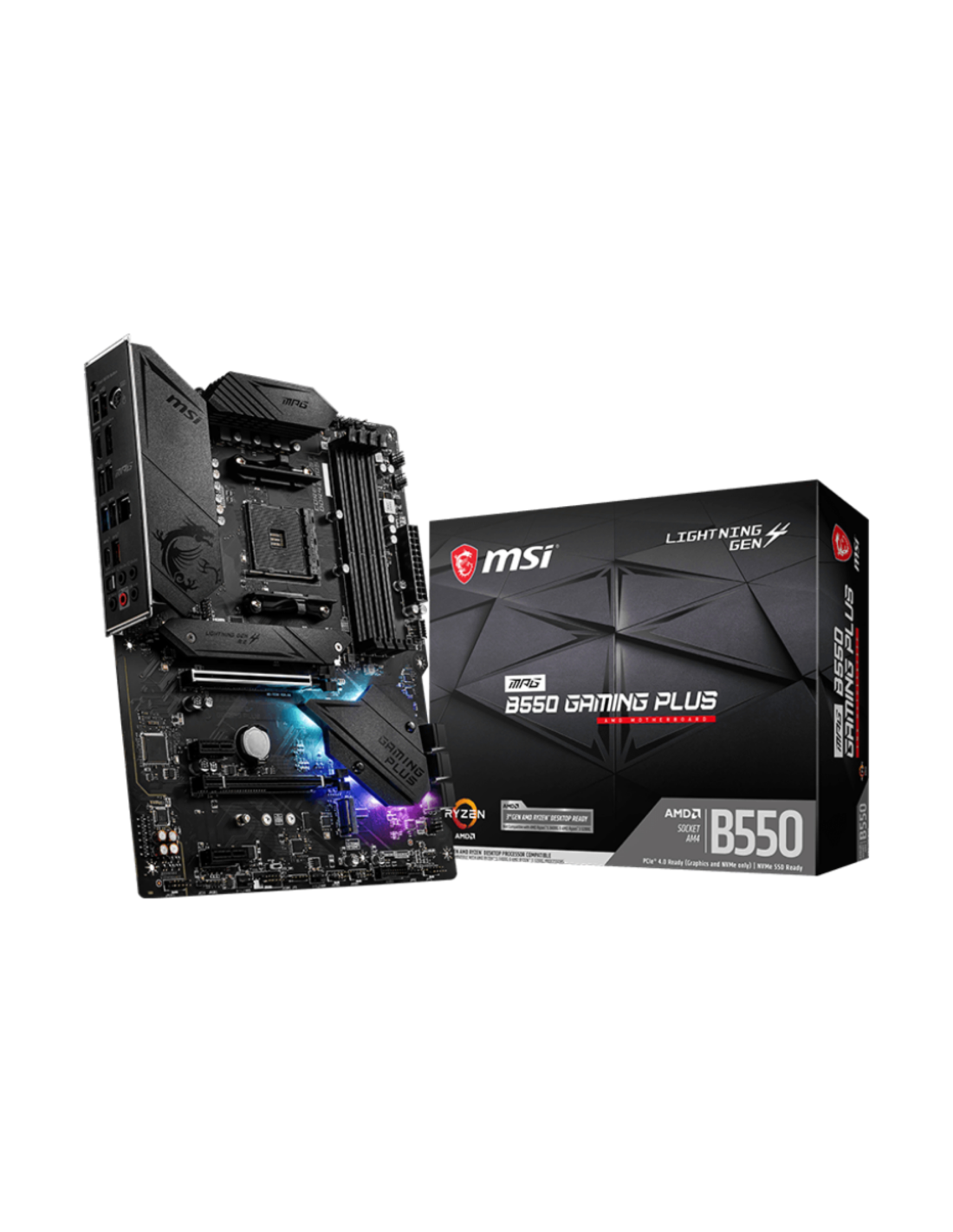 MSI MPG B550 Gaming Plus. Fabricante de procesador: AMD, Socket de procesador: Zócalo AM4, Procesador compatible: AMD Ryzen 3000 Series. tipos de memoria compatibles: DDR4-SDRAM, Memoria interna máxima: 128 GB, Tipo de ranuras de memoria: DIMM. Interfaces de disco de almacenamiento soportados: SATA III, Tipos de unidades de almacenamiento admitidas: HDD & SSD, Niveles RAID: 0, 1, 10. Soporte para proceso paralelo: 2-Way CrossFireX, Memoria máxima de adaptador de gráficos: 16000 MB, Máxima resolución: 4096 x