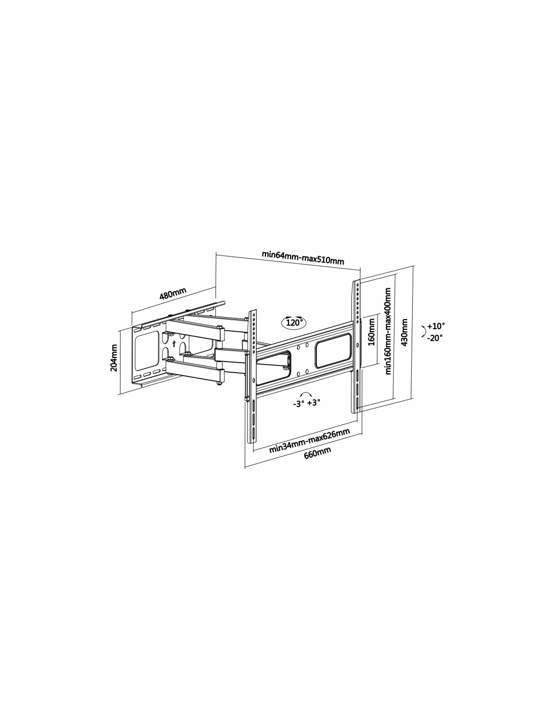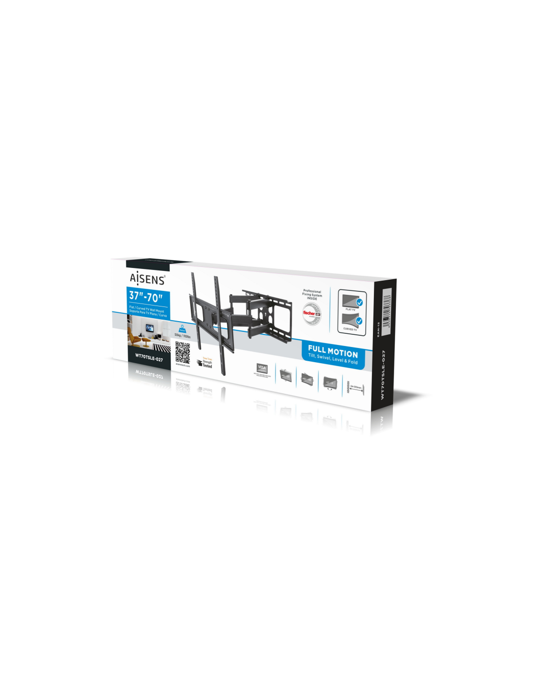 AISENS WT70TSLE-027. Capacidad máxima de peso: 50 kg, Tamaño mínimo de pantalla: 94 cm (37"), Tamaño máximo de pantalla: 177,8 cm (70"), Compatibilidad con interfaz de montaje (min): 200 x 200 mm, Compatibilidad con interfaz de montaje (max): 600 x 400 mm. Ángulo de inclinación: -20 - 10°, Ángulo de rotación: 60°, Distancia a la pared (min): 6,4 cm, Distancia a la pared (max): 51 cm. Color del producto: Negro