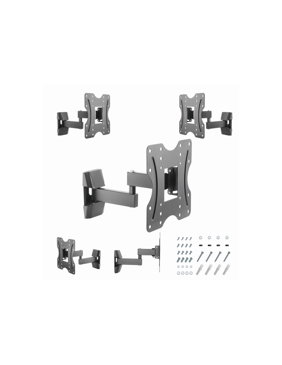 Gembird WM-42ST-01. Capacidad máxima de peso: 20 kg, Tamaño mínimo de pantalla: 58,4 cm (23"), Tamaño máximo de pantalla: 106,7 cm (42"), Compatibilidad con interfaz de montaje (min): 100 x 100 mm, Compatibilidad con interfaz de montaje (max): 200 x 200 mm. Ángulo de inclinación: -10 - 3°, Ángulo de giro (alcance): 90 - 90°, Distancia a la pared (min): 5,6 cm, Distancia a la pared (max): 30 cm. Color del producto: Negro