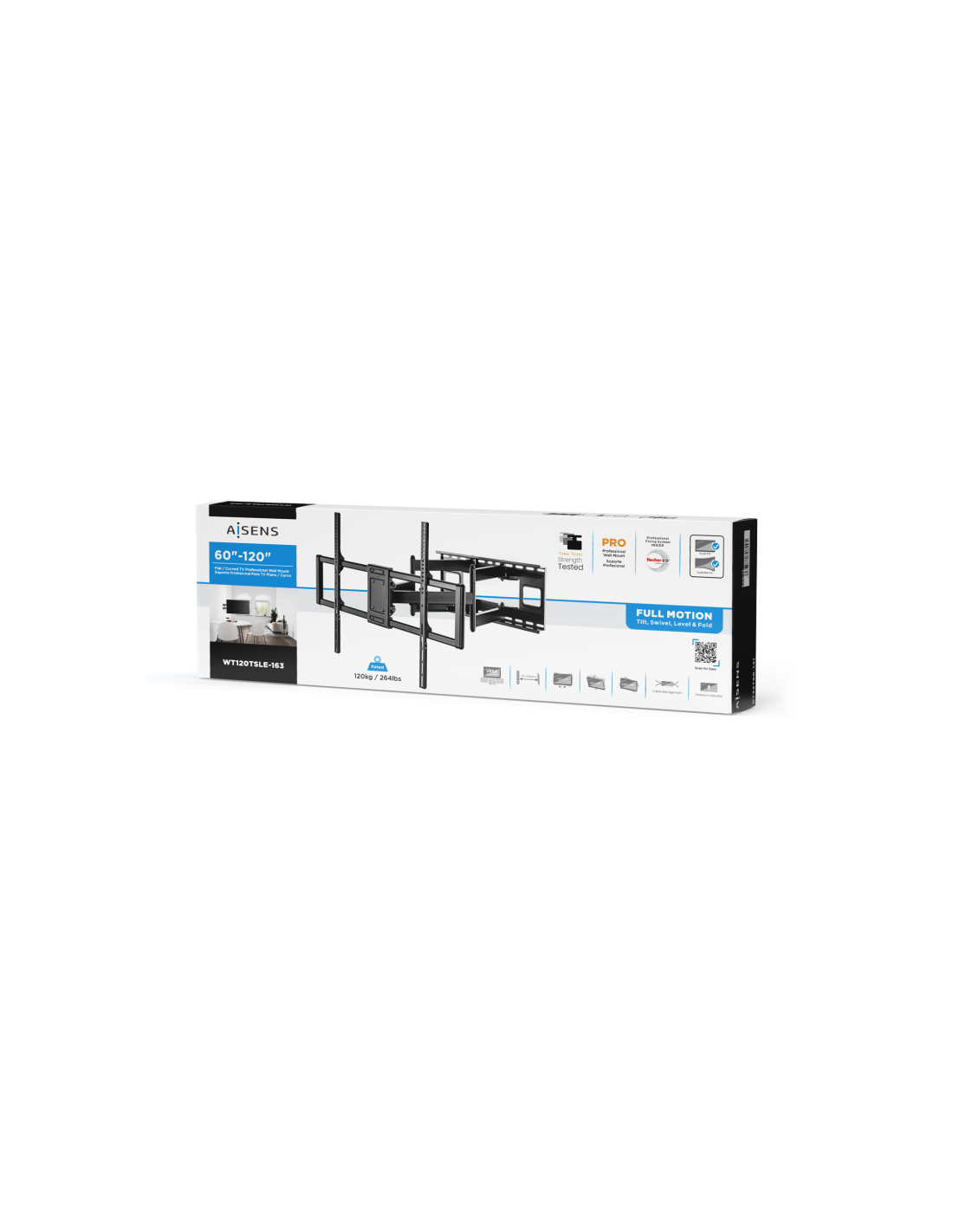 AISENS Soporte Pro Giratorio, Inclinable Y Nivelable Para Monitor/tv 120kg De 60-120, Negro. Capacidad máxima de peso: 120 kg, Tamaño mínimo de pantalla: 152,4 cm (60"), Tamaño máximo de pantalla: 3,05 m (120"), Compatibilidad con interfaz de montaje (min): 200 x 200 mm, Compatibilidad con interfaz de montaje (max): 900 x 600 mm. Ángulo de inclinación: -15 - 5°, Ángulo de giro (alcance): -60 - 60°, Distancia a la pared (min): 7,5 cm, Distancia a la pared (max): 70,3 cm. Color del producto: Negro