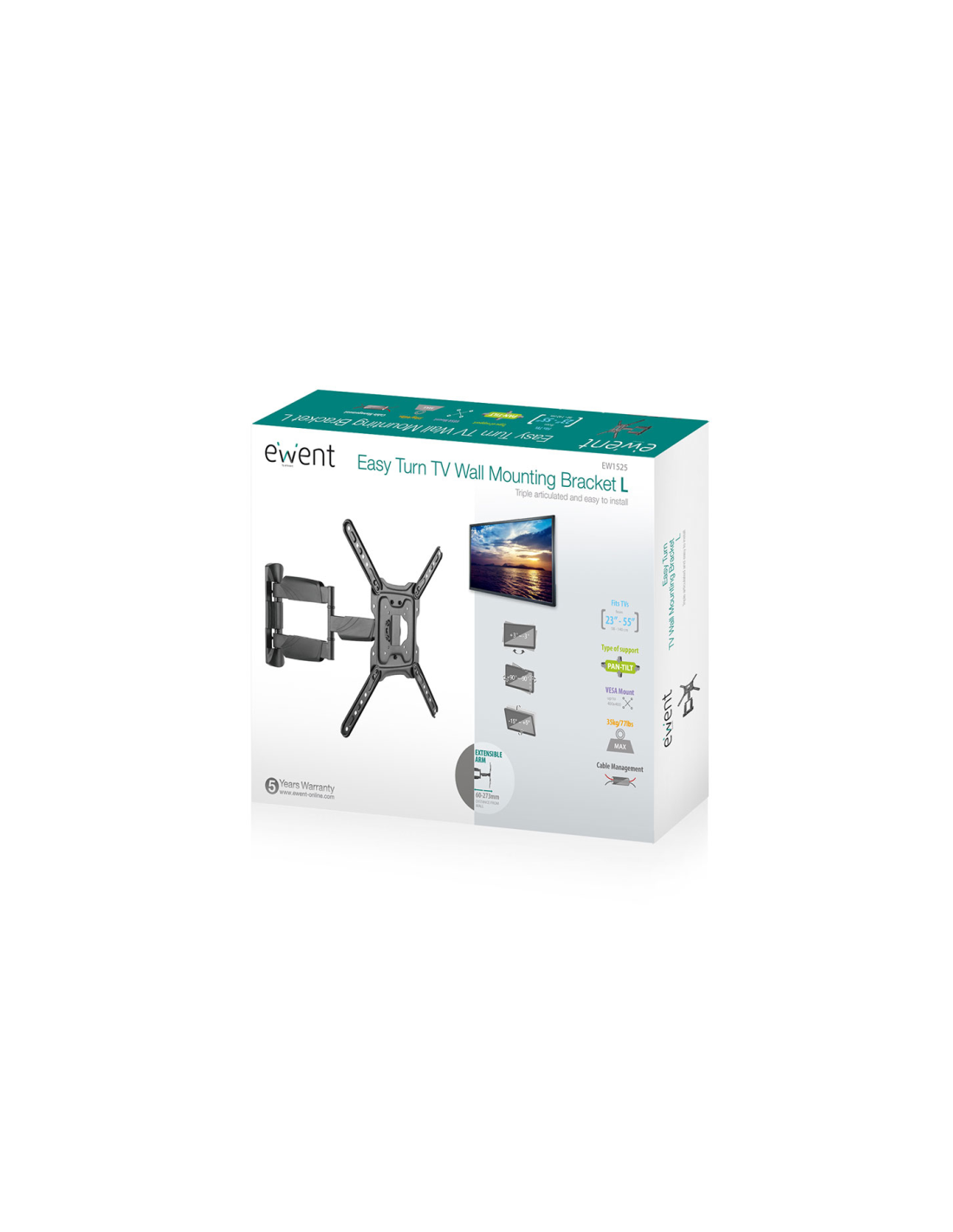 Ewent EW1525. Capacidad máxima de peso: 35 kg, Tamaño mínimo de pantalla: 58,4 cm (23"), Tamaño máximo de pantalla: 139,7 cm (55"), Compatibilidad con interfaz de montaje (min): 75 x 75 mm, Compatibilidad con interfaz de montaje (max): 400 x 400 mm. Ángulo de inclinación: -15 - 15°, Ángulo de giro (alcance): -90 - 90°. Color del producto: Negro