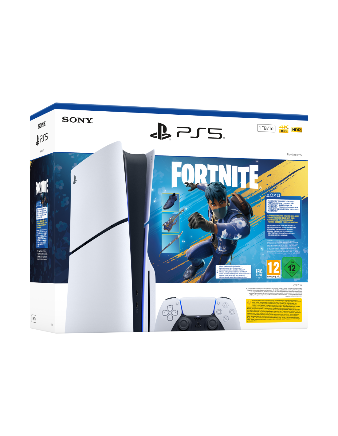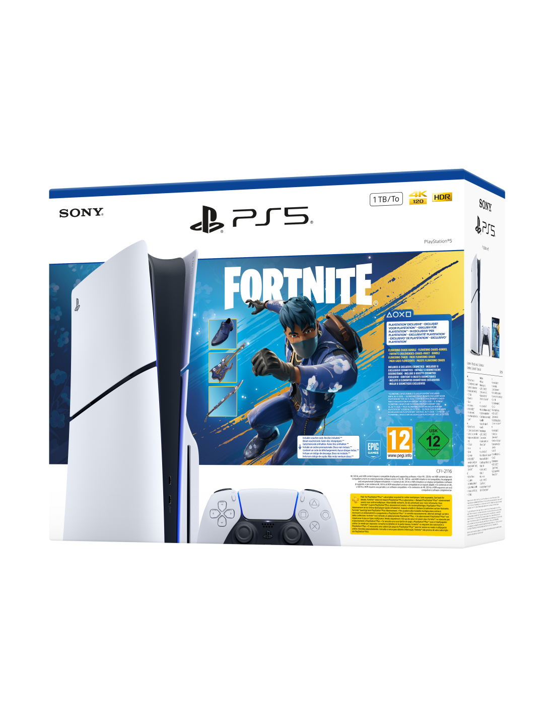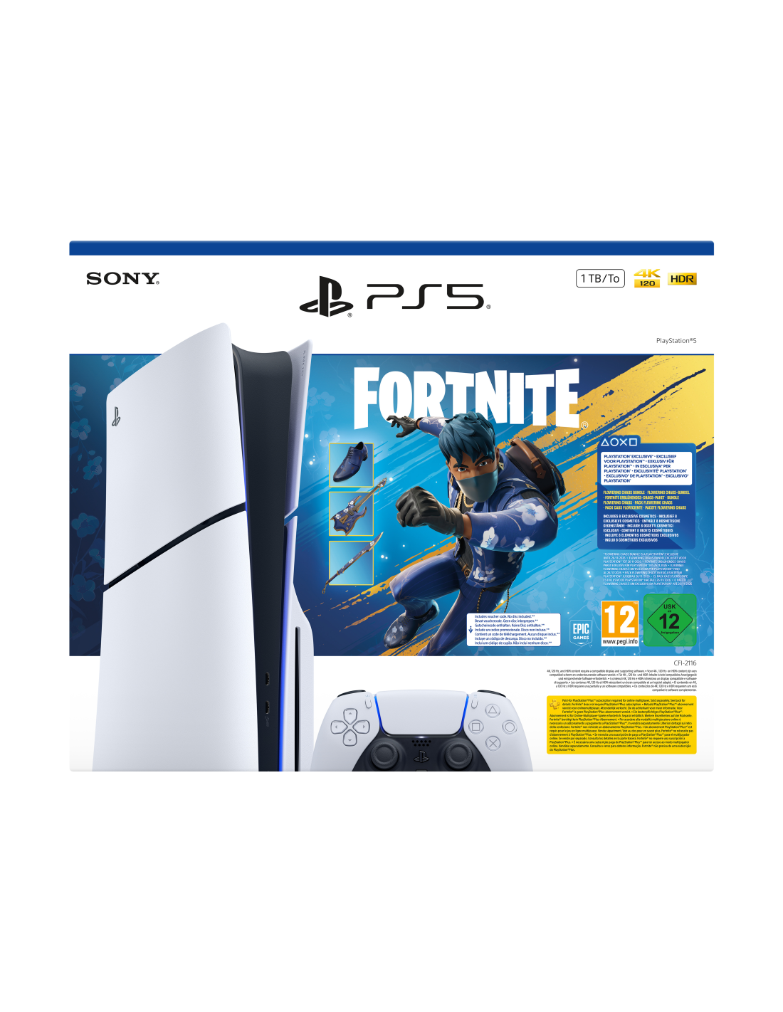 Sony PlayStation 5 - Fortnite Flowering Chaos Bundle. Plataforma: PlayStation 5, Color del producto: Negro, Blanco, Memoria interna: 16384 MB. Unidad de almacenamiento: SSD, Capacidad de almacenamiento interno: 1 TB, Velocidad de lectura: 5500 MB/s. Ethernet LAN, velocidad de transferencia de datos: 10,1000,100 Mbit/s, Tipo de interfaz ethernet: Gigabit Ethernet, Wi-Fi estándares: 802.11a, Wi-Fi 5 (802.11ac), 802.11b, Wi-Fi 6 (802.11ax), 802.11g, Wi-Fi 4 (802.11n). Tipo HD: 8K Ultra HD, Formato de vídeo sop
