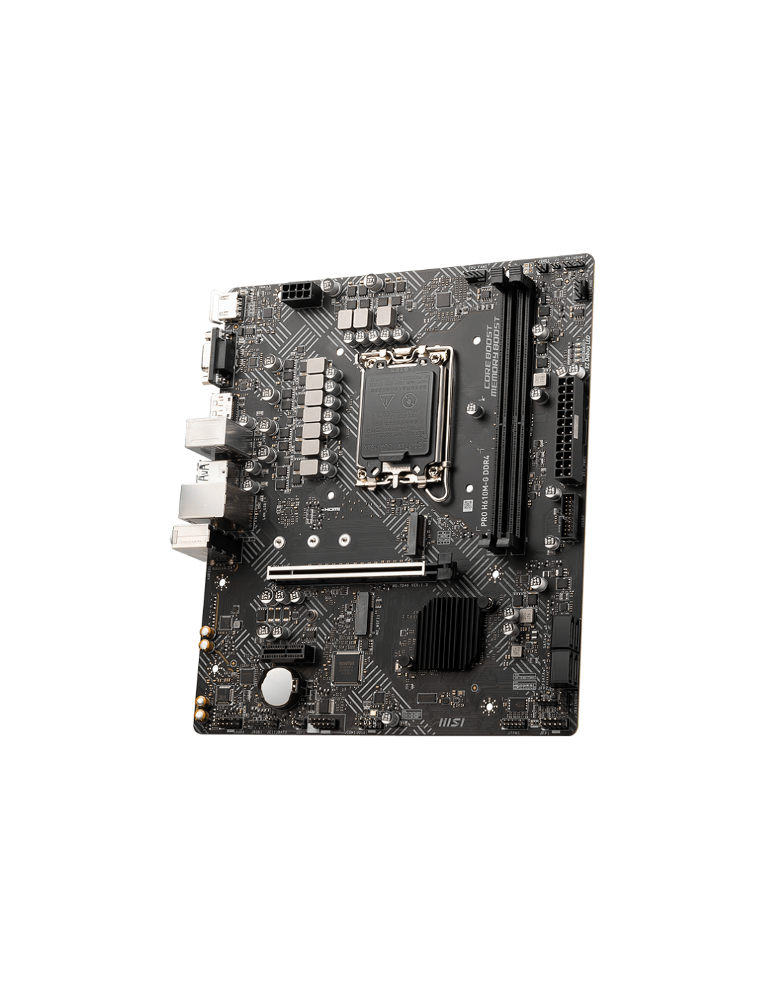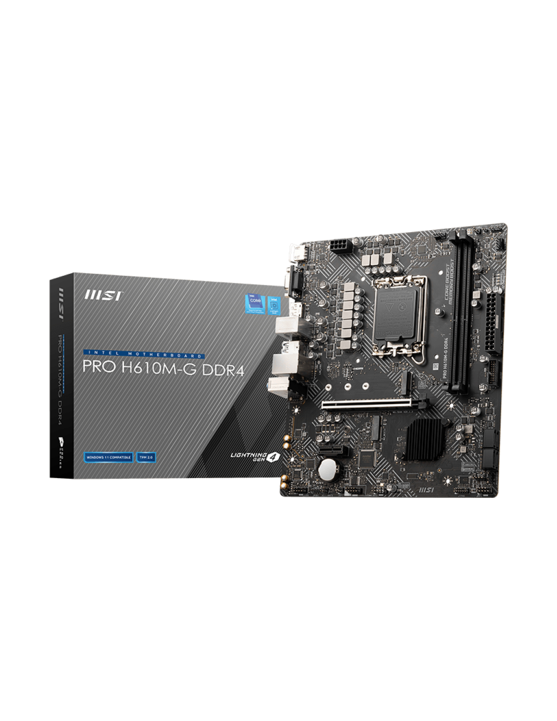 MSI PRO H610M-G DDR4. Fabricante de procesador: Intel, Socket de procesador: LGA 1700, Procesador compatible: Intel® Core™ i9. tipos de memoria compatibles: DDR4-SDRAM, Memoria interna máxima: 64 GB, Tipo de ranuras de memoria: DIMM. Interfaces de disco de almacenamiento soportados: M.2, SATA III, Tipos de unidades de almacenamiento admitidas: SSD. Tipo de interfaz ethernet: Gigabit Ethernet. Componente para: PC, Factor de forma: micro ATX, Familia del chipset: Intel