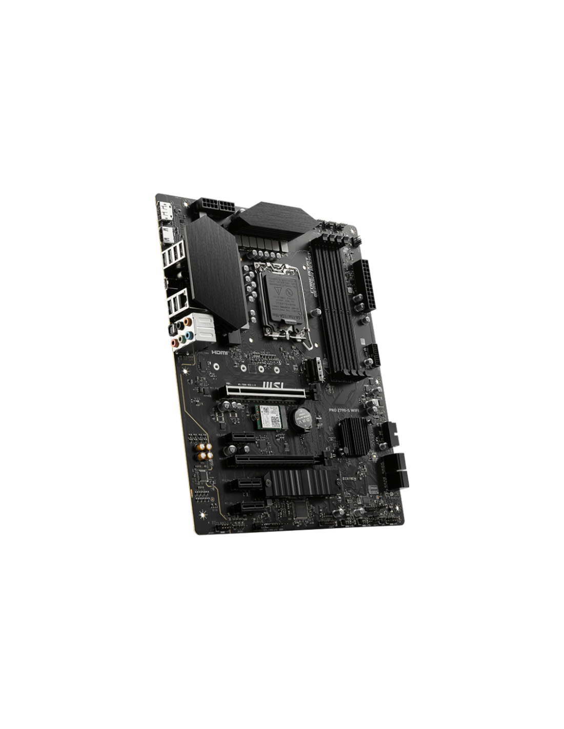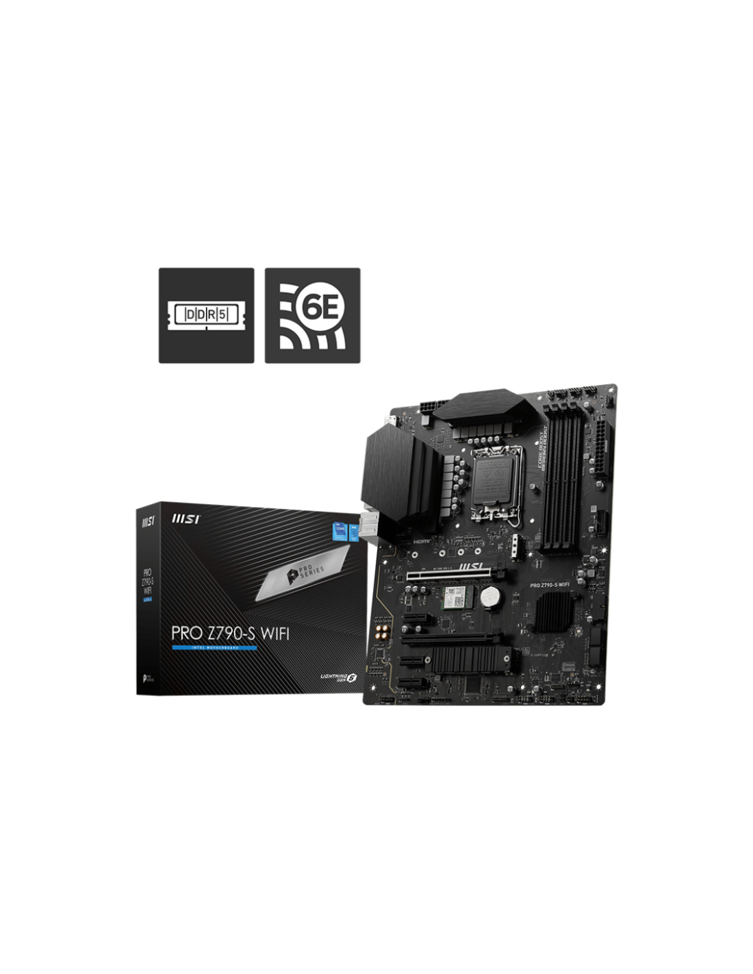 MSI PRO Z790-S WIFI. Fabricante de procesador: Intel, Socket de procesador: LGA 1700, Procesador compatible: Intel® Celeron®, Intel® Pentium® Gold. tipos de memoria compatibles: DDR5-SDRAM, Memoria interna máxima: 192 GB, Compatibilidad de ECC: No-ECC. Interfaces de disco de almacenamiento soportados: M.2, PCI Express, Tipos de unidades de almacenamiento admitidas: HDD & SSD, Niveles RAID: 0, 1, 5, 10. Tipo de interfaz ethernet: 2.5 Gigabit Ethernet, Estándar Wi-Fi: Wi-Fi 6 (802.11ax), Wi-Fi estándares: 802