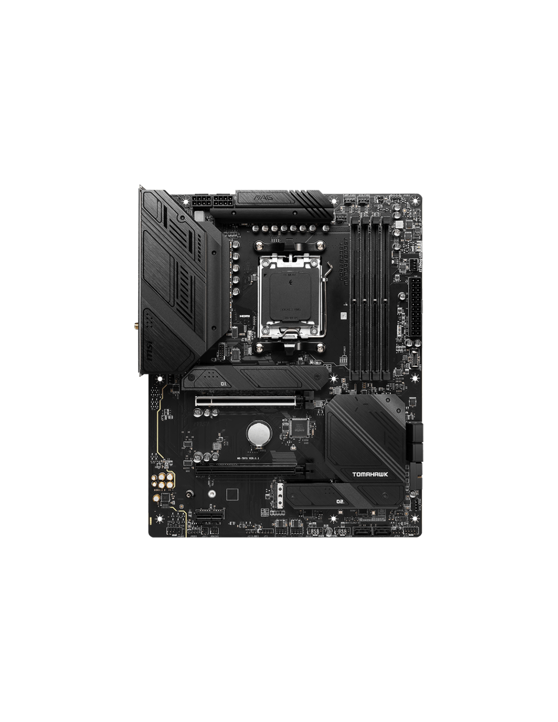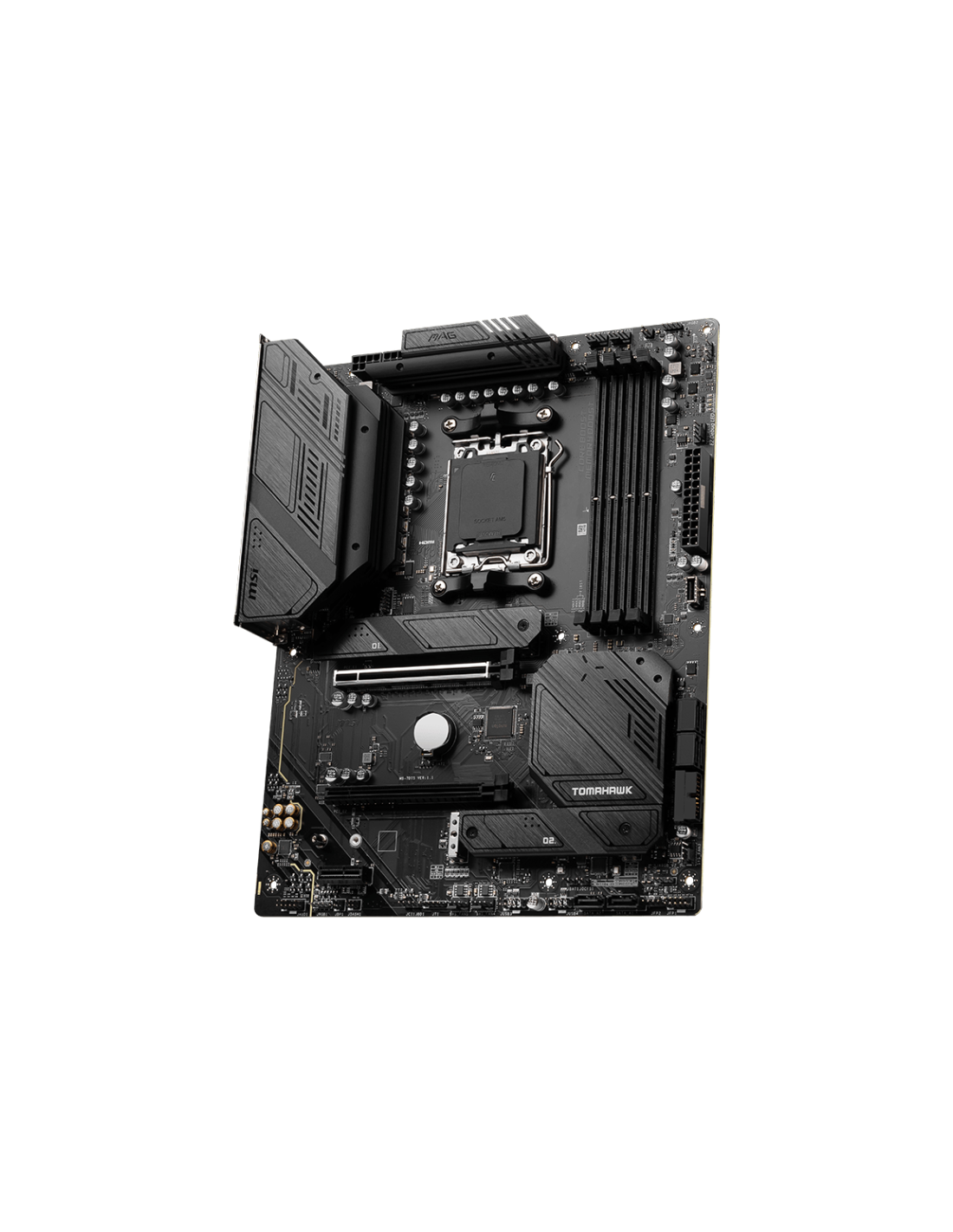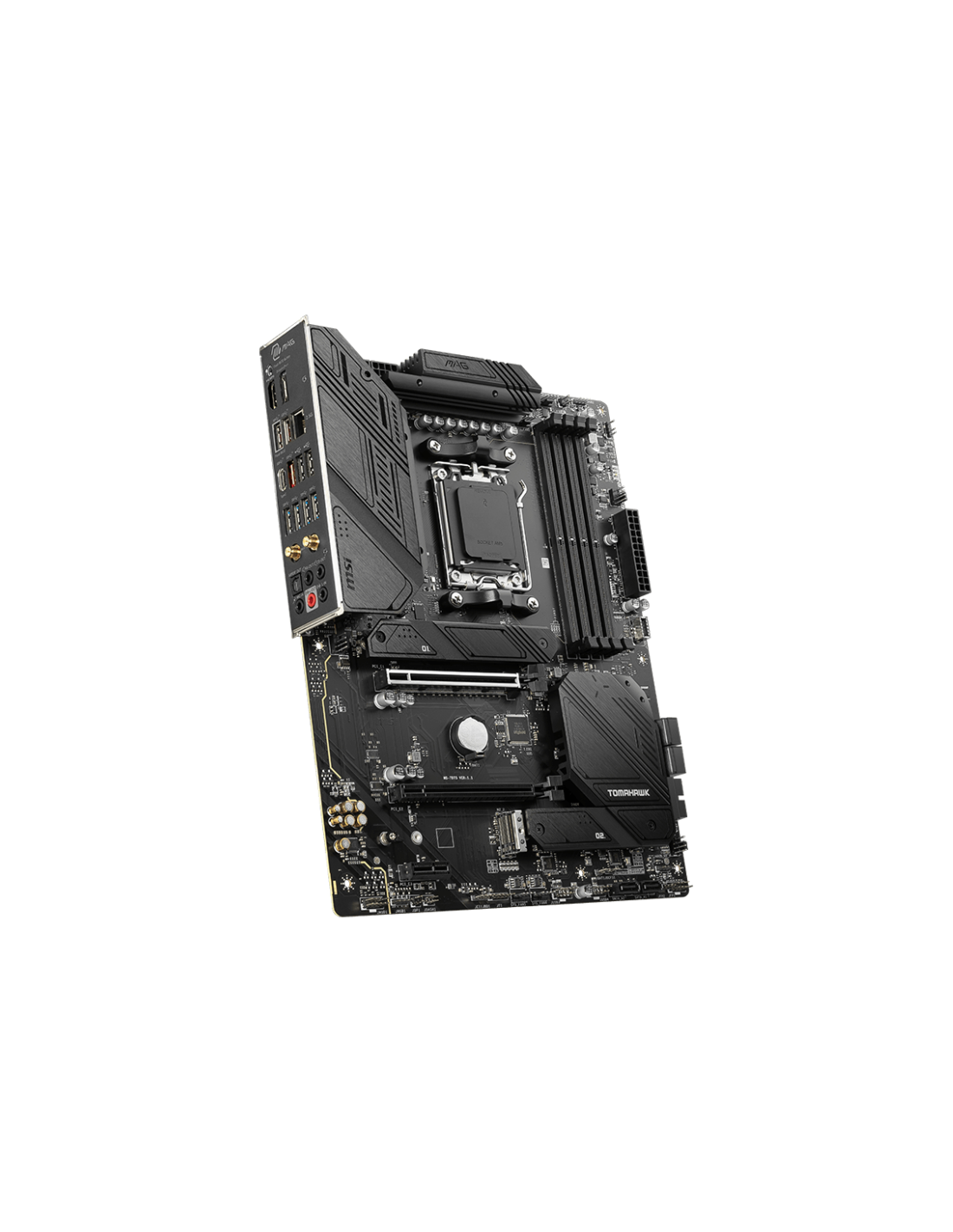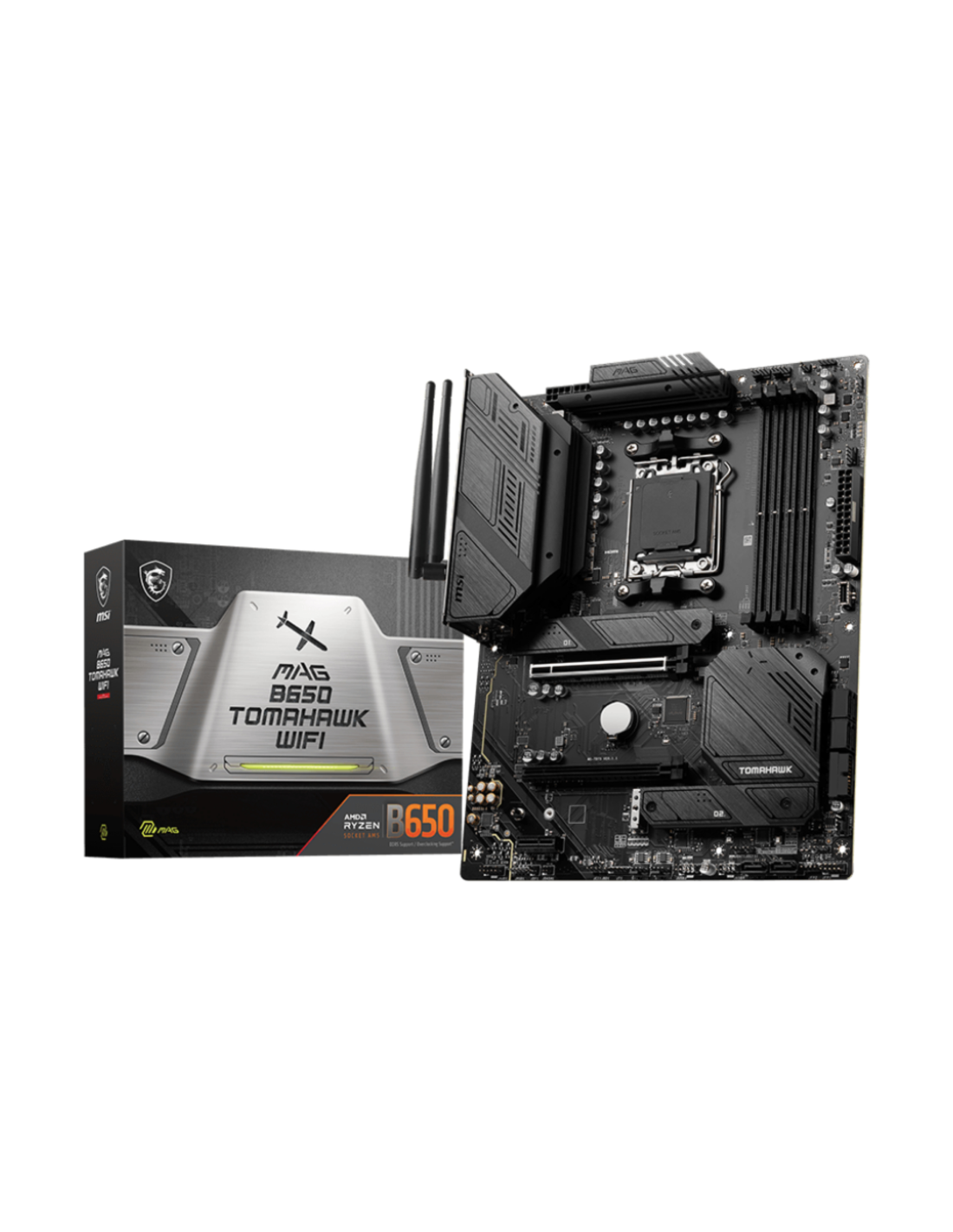 MSI MAG B650 Tomahawk WIFI. Fabricante de procesador: AMD, Socket de procesador: Zócalo AM5, Procesador compatible: AMD Ryzen 7000 Series. tipos de memoria compatibles: DDR5-SDRAM, Memoria interna máxima: 128 GB, Compatibilidad de ECC: No-ECC. Interfaces de disco de almacenamiento soportados: M.2, SATA, Niveles RAID: 0, 1, 10. Tipo de interfaz ethernet: 2.5 Gigabit Ethernet, Controlador LAN: Realtek RTL8125B, Estándar Wi-Fi: Wi-Fi 6E (802.11ax). Componente para: PC, Factor de forma: ATX, Familia del chipset