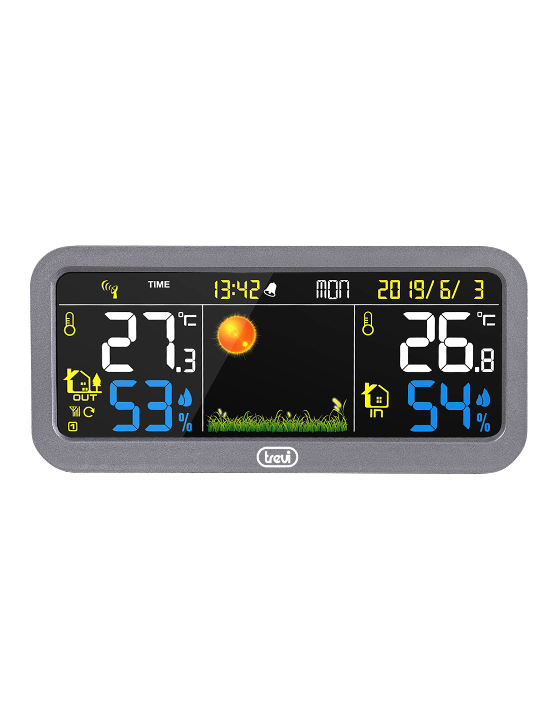 Trevi ME 3P20 RC. Color del producto: Gris, Funciones de medición: Termómetro de interior, Barómetro para exteriores, Termómetro para exteriores, Tendencia en pantalla de función de medida: Barómetro, Higrómetro, Termómetro. Tipo de visualizador: LCD, Diagonal de la pantalla: 16 cm (6.3"). Fuente de energía: AC/Batería, Tipo de batería: AAA, Voltaje: 230 V. Ancho: 175 mm, Profundidad: 30 mm, Altura: 80 mm. Tecnología de conectividad: Alámbrico