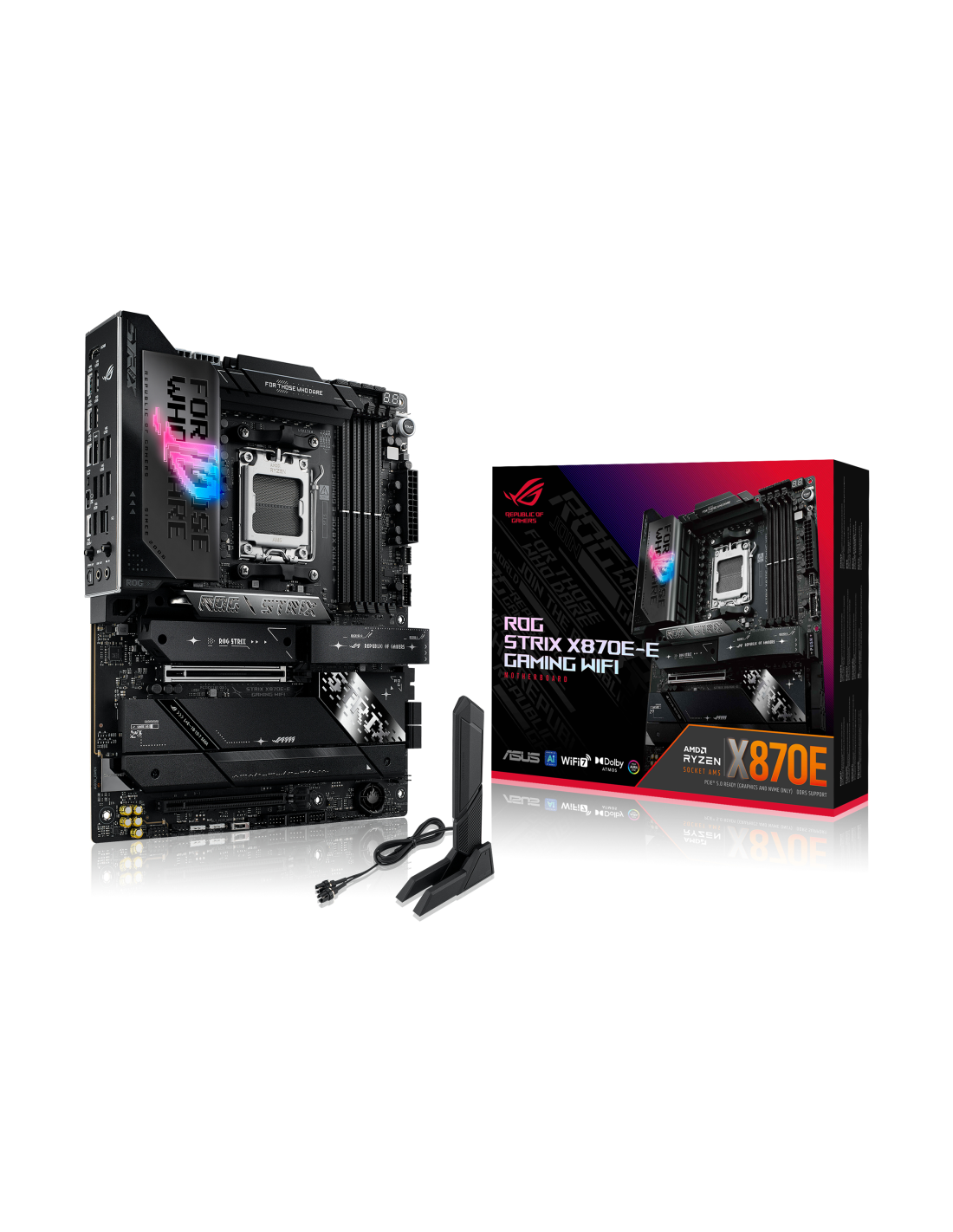 ASUS ROG STRIX X870E-E GAMING WIFI. Fabricante de procesador: AMD, Socket de procesador: Zócalo AM5, Sockets de procesador soportados: Zócalo AM5. tipos de memoria compatibles: DDR5-SDRAM, Memoria interna máxima: 192 GB, Tipo de ranuras de memoria: DIMM. Interfaces de disco de almacenamiento soportados: M.2, SATA III, Tipos de unidades de almacenamiento admitidas: HDD & SSD, Niveles RAID: 0, 1, 10, 5. Tipo de interfaz ethernet: 5 Gigabit Ethernet, Estándar Wi-Fi: Wi-Fi 7 (802.11be), Wi-Fi estándares: Wi-Fi 7 (802.11be). Componente para: PC, Factor de forma: ATX, Familia del chipset: AMD
