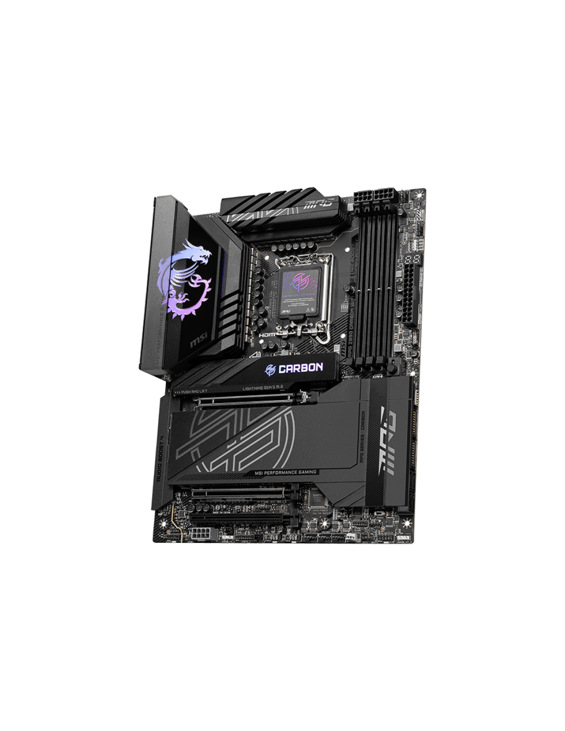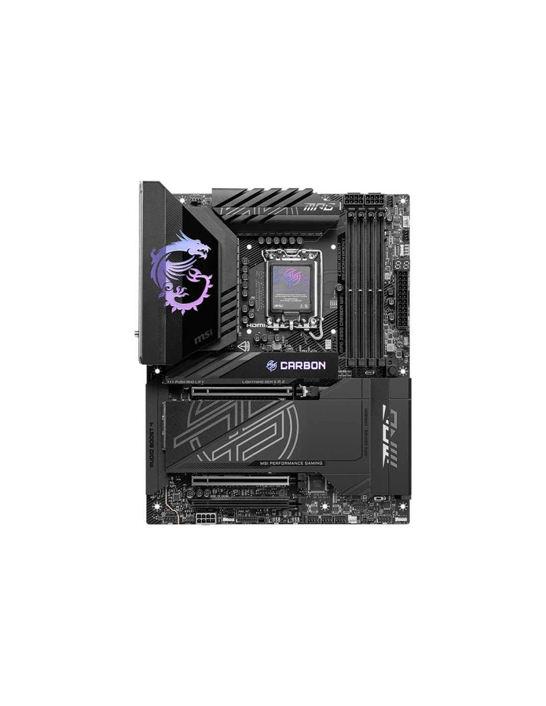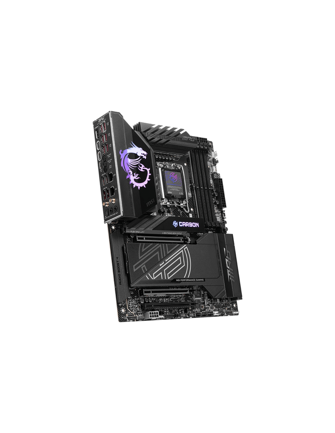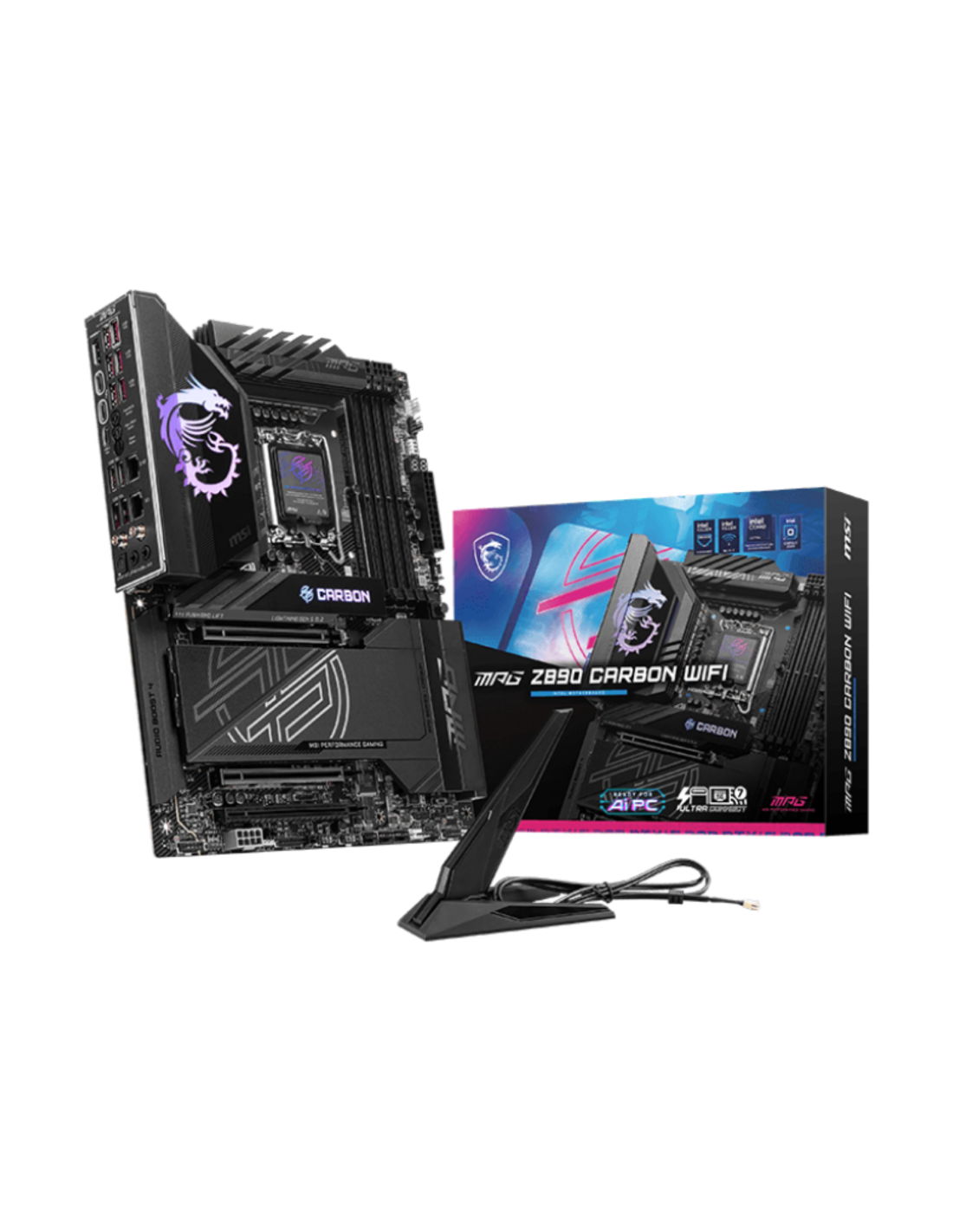 MSI MPG Z890 CARBON WIFI. Fabricante de procesador: Intel, Socket de procesador: LGA 1851 (Socket V1), Procesador compatible: Intel Core Ultra (Series 2). tipos de memoria compatibles: DDR5-SDRAM, Memoria interna máxima: 256 GB, Tipo de ranuras de memoria: DIMM. Interfaces de disco de almacenamiento soportados: M.2, SATA III, Tipos de unidades de almacenamiento admitidas: HDD & SSD, Niveles RAID: 0, 5, 10. Tipo de interfaz ethernet: 2.5 Gigabit Ethernet, 5 Gigabit Ethernet, Estándar Wi-Fi: Wi-Fi 7 (802.11be