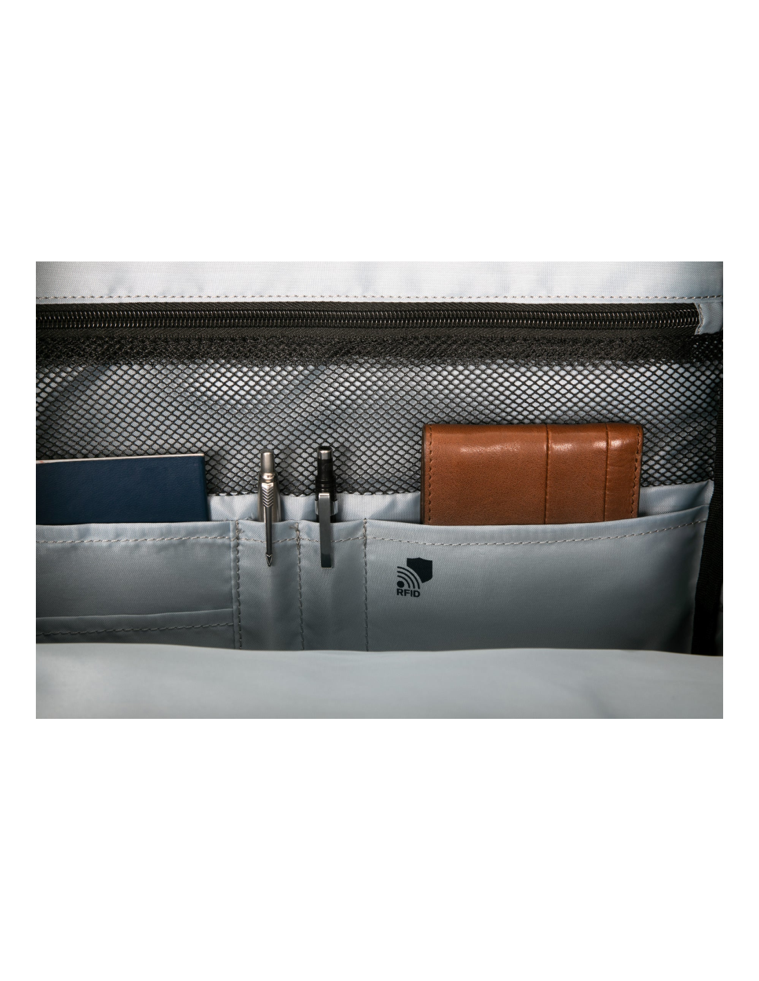 - Bolsillo de documentos, Compartimento para bolígrafos, Bolsillo con cremallera