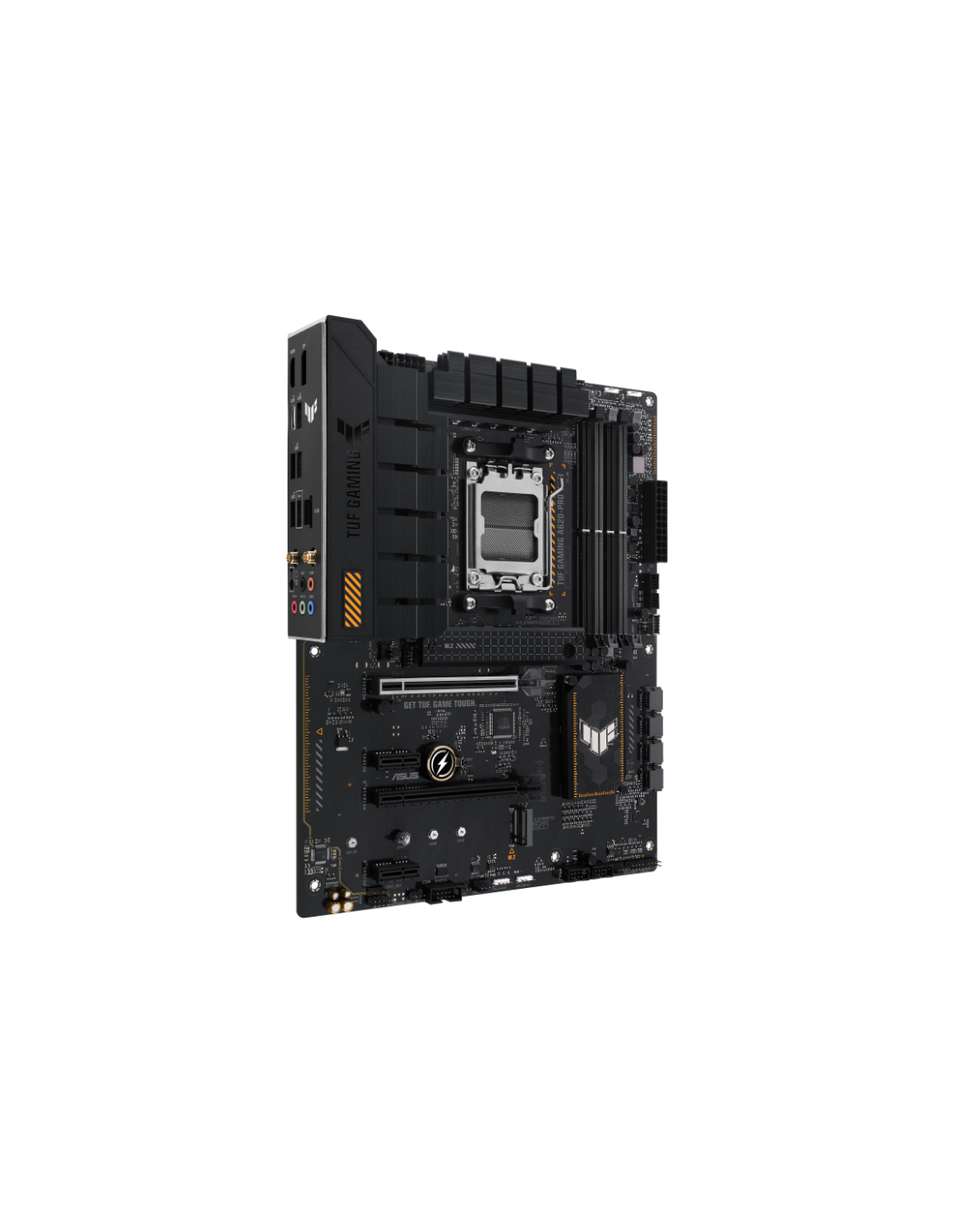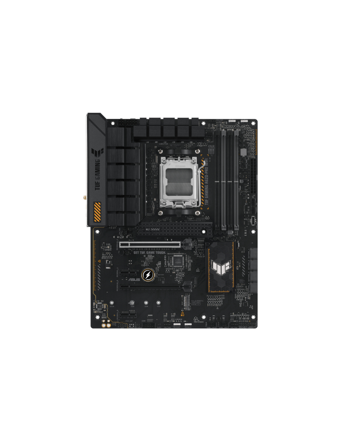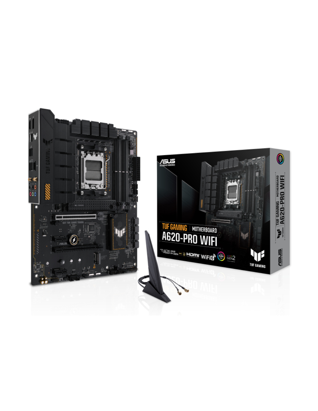 ASUS TUF GAMING A620-PRO WIFI. Fabricante de procesador: AMD, Socket de procesador: Zócalo AM5, Procesador compatible: AMD Ryzen 5000 Series, AMD Ryzen 7000 Series. tipos de memoria compatibles: DDR5-SDRAM, Memoria interna máxima: 192 GB, Tipo de ranuras de memoria: DIMM. Interfaces de disco de almacenamiento soportados: M.2, SATA III, Tipos de unidades de almacenamiento admitidas: HDD & SSD, Niveles RAID: 0, 1, 10. Tipo de interfaz ethernet: 2.5 Gigabit Ethernet, Estándar Wi-Fi: Wi-Fi 6 (802.11ax), Wi-Fi e