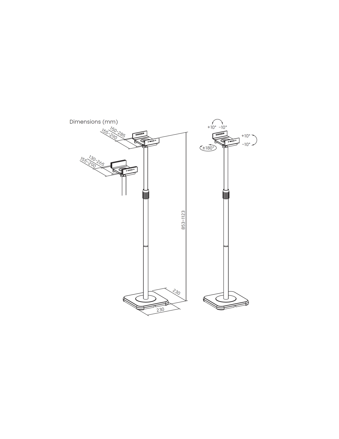 AISENS Soporte Universal De Suelo Giratorio E Inclinable Para Altavoces, Negro. Ubicación: Piso, Material: Acero, Capacidad máxima de peso: 5 kg. Altura (min.): 85,3 cm, Altura (máx.): 112,3 cm, Rango de ajuste a anchura: 130 - 285 mm. Profundidad del paquete: 435 mm, Altura del paquete: 95 mm, Ancho del paquete: 312 mm. Ancho de la caja principal: 330 mm, Longitud de la caja: 450 mm, Alto de la caja principal: 310 mm
