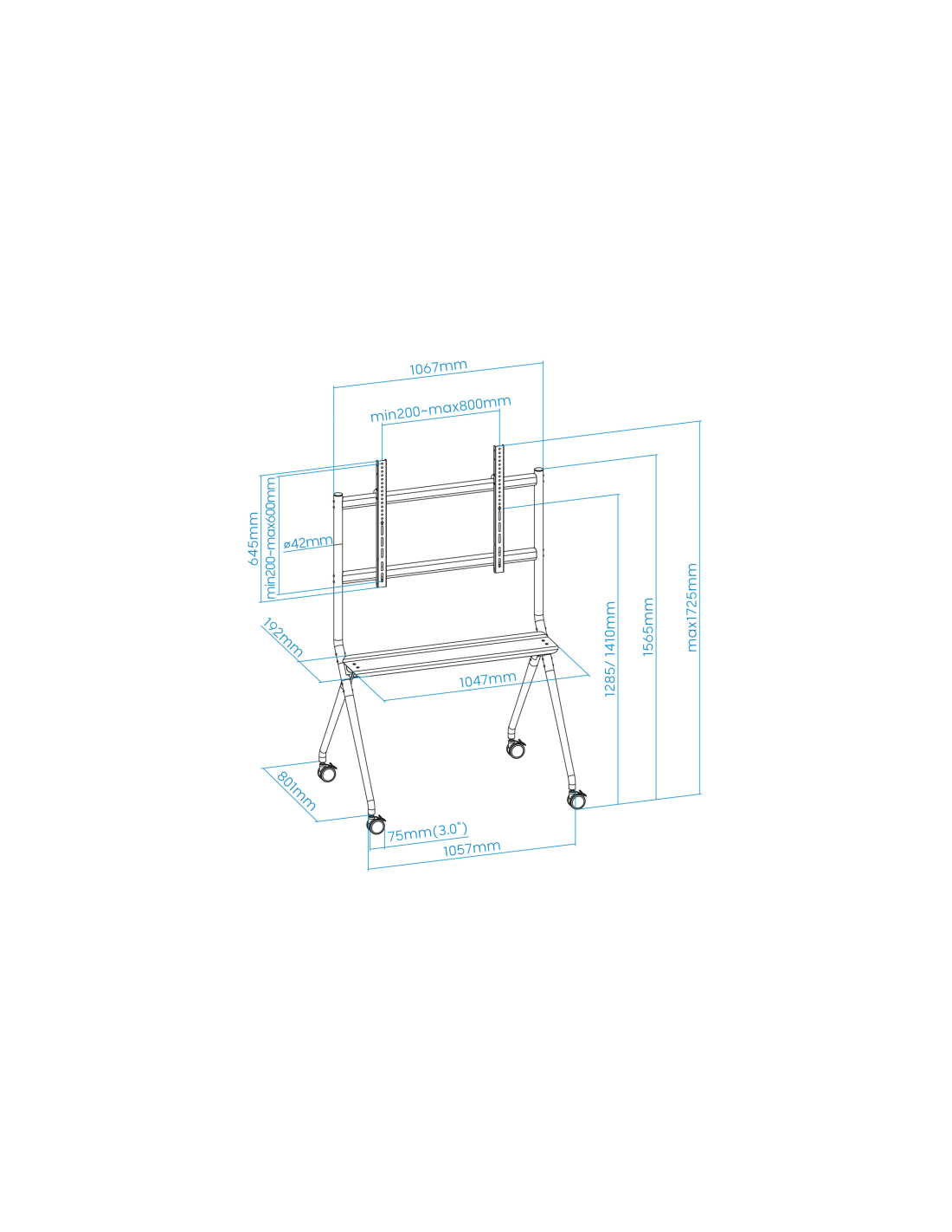 TooQ iSTAND Soporte de Suelo con Ruedas para Pantallas 50"- 86", Gris. Capacidad máxima de peso: 120 kg, Tamaño mínimo de pantalla: 127 cm (50"), Tamaño máximo de pantalla: 2,18 m (86"), Compatibilidad con interfaz de montaje (min): 200 x 200 mm, Compatibilidad con interfaz de montaje (max): 800 x 600 mm. Rango de ajustes de altura: 1600 - 1725 mm. Color del producto: Gris