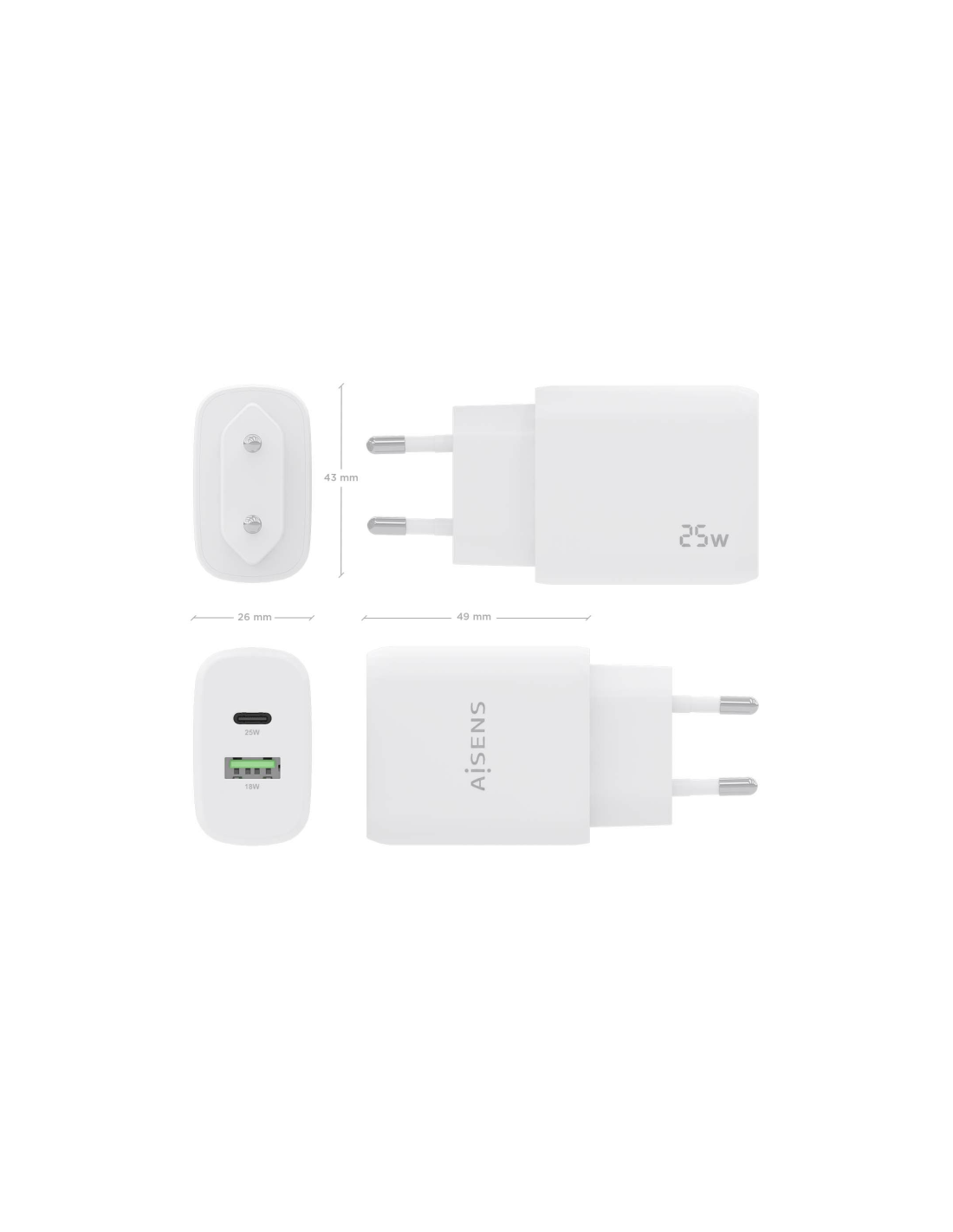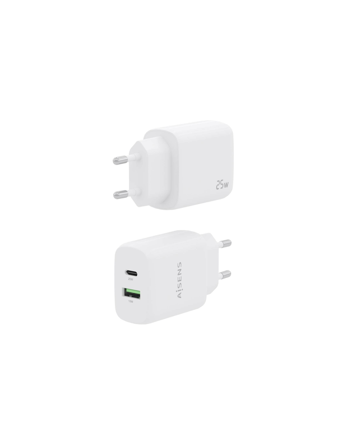 AISENS Cargador 25W, 1xUSB-C PD3.0, 1xUSB-A QC3.0, Blanco. Tipo de cargador: Interior, Alimentación: Corriente alterna, Compatibilidad del cargador: Universal. Voltaje de entrada: 100 - 240 V, Voltaje de salida máximo: 12,27 V. Cantidad de puertos USB 2.0: 1, Número de puertos USB Tipo C: 1, Carga rápida, Funciones de protección de poder: Sobrecarga, Sobrecarga, Cortocircuito. Color del producto: Blanco