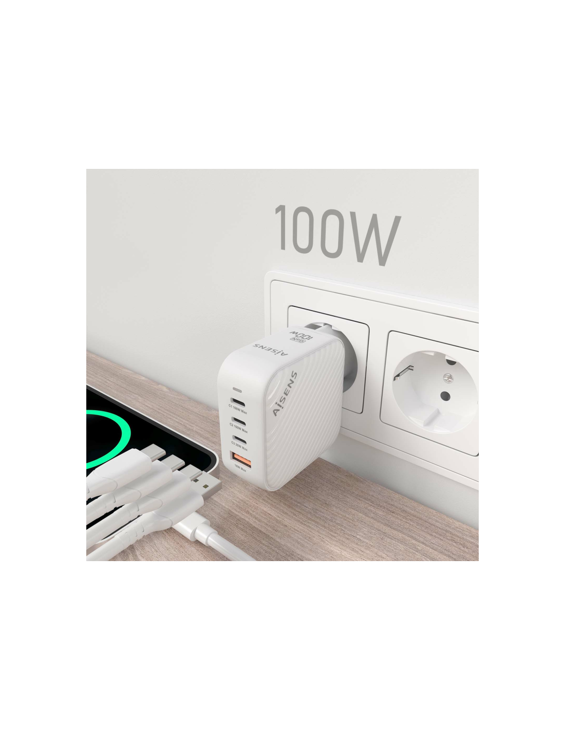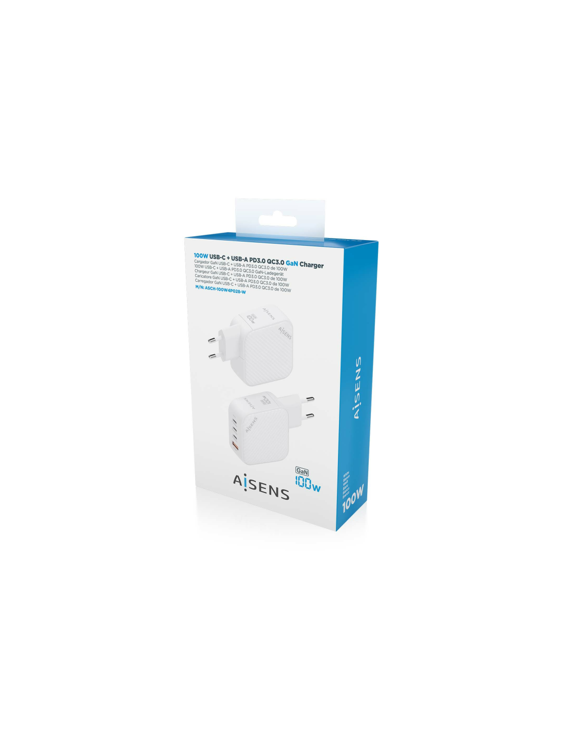 Aisens - Cargador GaN 100W, 3xUSB-C PD3.0 QC4.0, 1xUSB-A QC3.0, Blanco