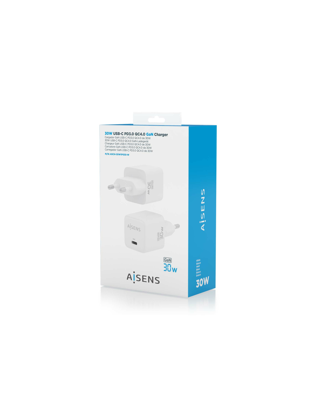 AISENS Cargador Gan 30W, 1xUSB-C PD3.0 QD4.0, Blanco. Tipo de cargador: Interior, Alimentación: Corriente alterna, Compatibilidad del cargador: Universal. Voltaje de entrada: 100 - 240 V. Número de puertos USB Tipo C: 1, Carga rápida, Funciones de protección de poder: Sobrecarga, Cortocircuito. Color del producto: Blanco