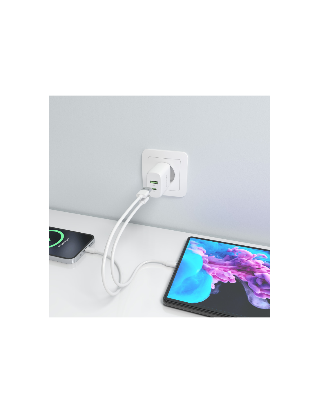 - Este cargador puede cargar simultáneamente 2 dispositivos USB-A y USB-C a máxima velocidad.