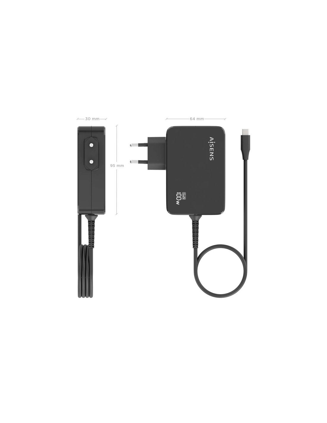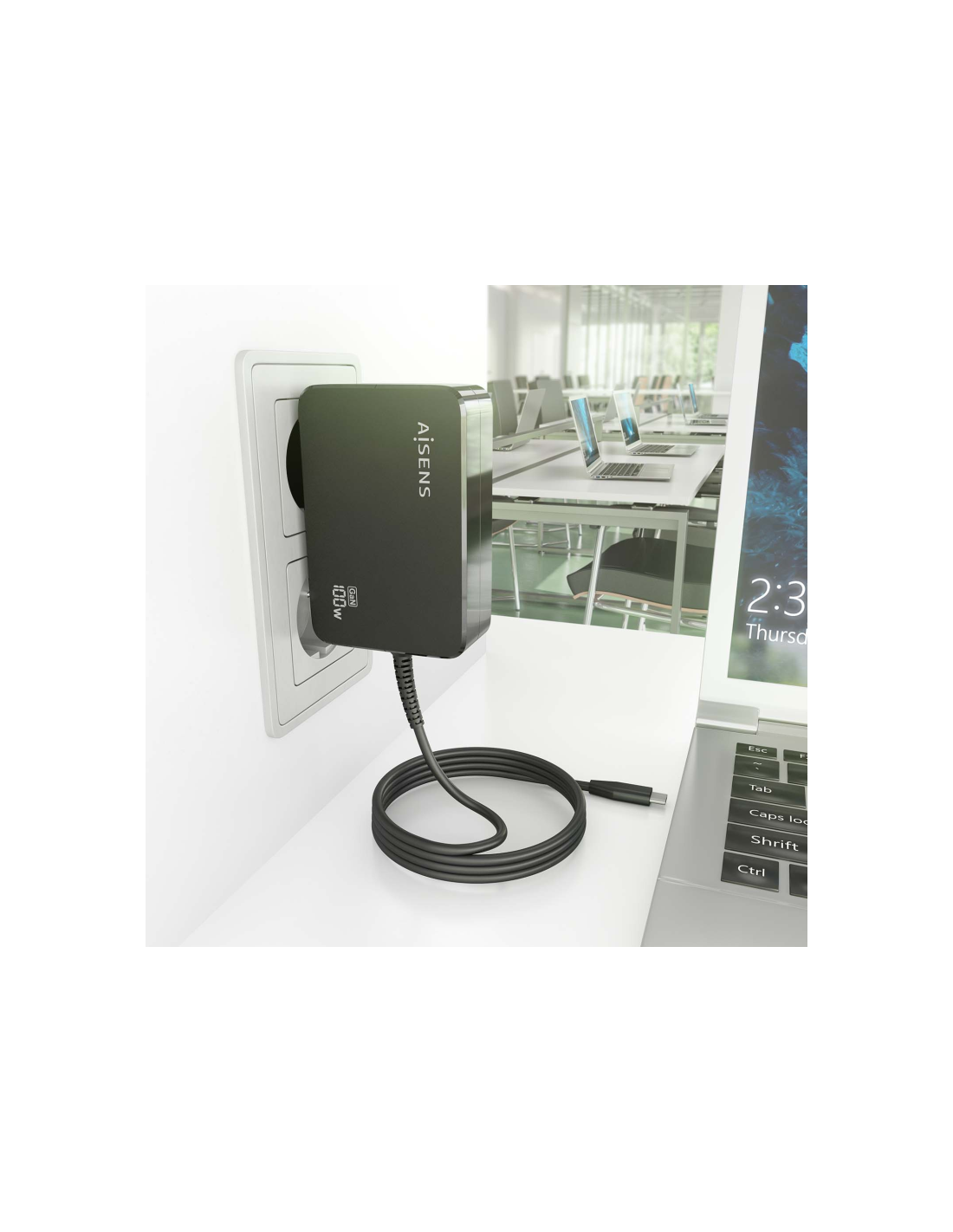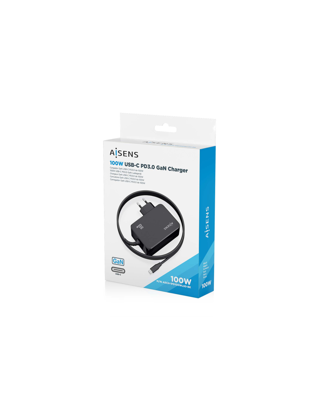 AISENS Cargador GaN 100W PD3.0 1xUSB-C 1.8m, Negro. Tipo de cargador: Interior, Alimentación: Corriente alterna, Compatibilidad del cargador: Cámara digital, GPS, Teléfono móvil, Portátil, Smartphone, Tableta, Universal. Voltaje de entrada: 100 - 240 V, Voltaje de salida máximo: 20 V, Corriente de salida de adaptador AC: 5 A. Número de puertos USB Tipo C: 1, Carga rápida, Funciones de protección de poder: Sobrecarga, Sobrecarga, Cortocircuito. Longitud de cable: 1,8 m, Color del producto: Negro
