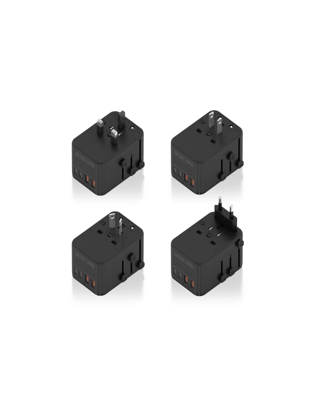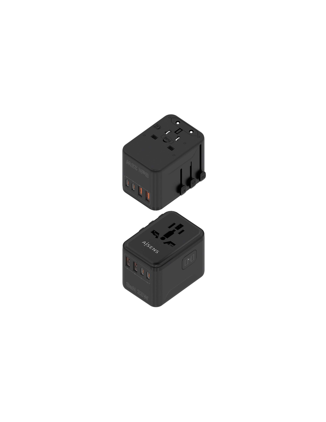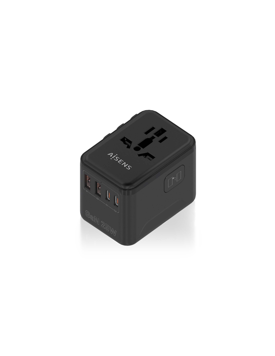 AISENS Adaptador Enchufe Universal Para Viaje EU/USA/UK/AU Con Cargador USB GaN, 2xUSB-A QC3.0, 2xUSB-C PD3.0 25W, Negro. Tipo de cargador: Interior, Alimentación: Corriente alterna, Compatibilidad del cargador: Universal. Voltaje de entrada: 100 - 250 V, Voltaje de salida máximo: 12 V, Corriente de salida de adaptador AC: 3 A. Cantidad de puertos USB 2.0: 2, Número de puertos USB Tipo C: 2, Carga rápida, Funciones de protección de poder: Sobreintensidad, Sobrevoltaje, Sobrecalentamiento, Cortocircuito. Col