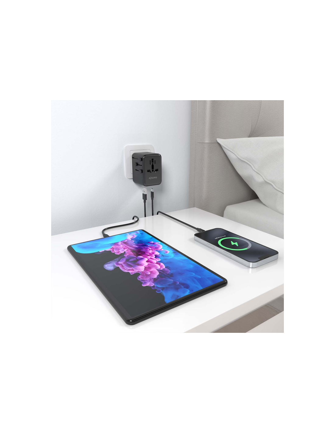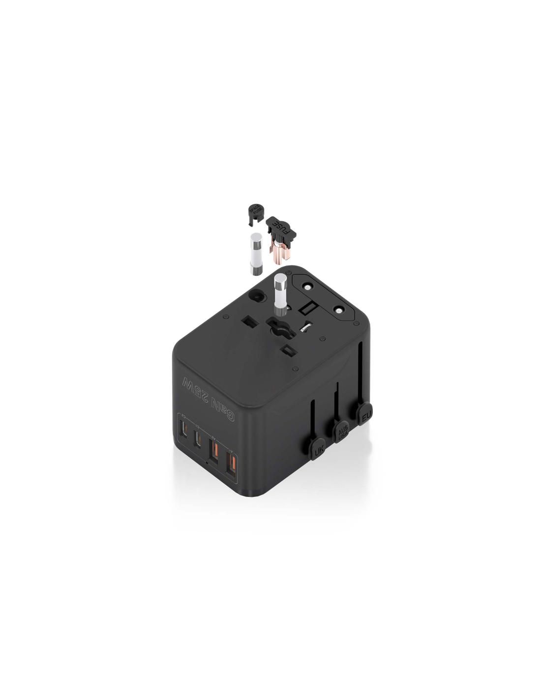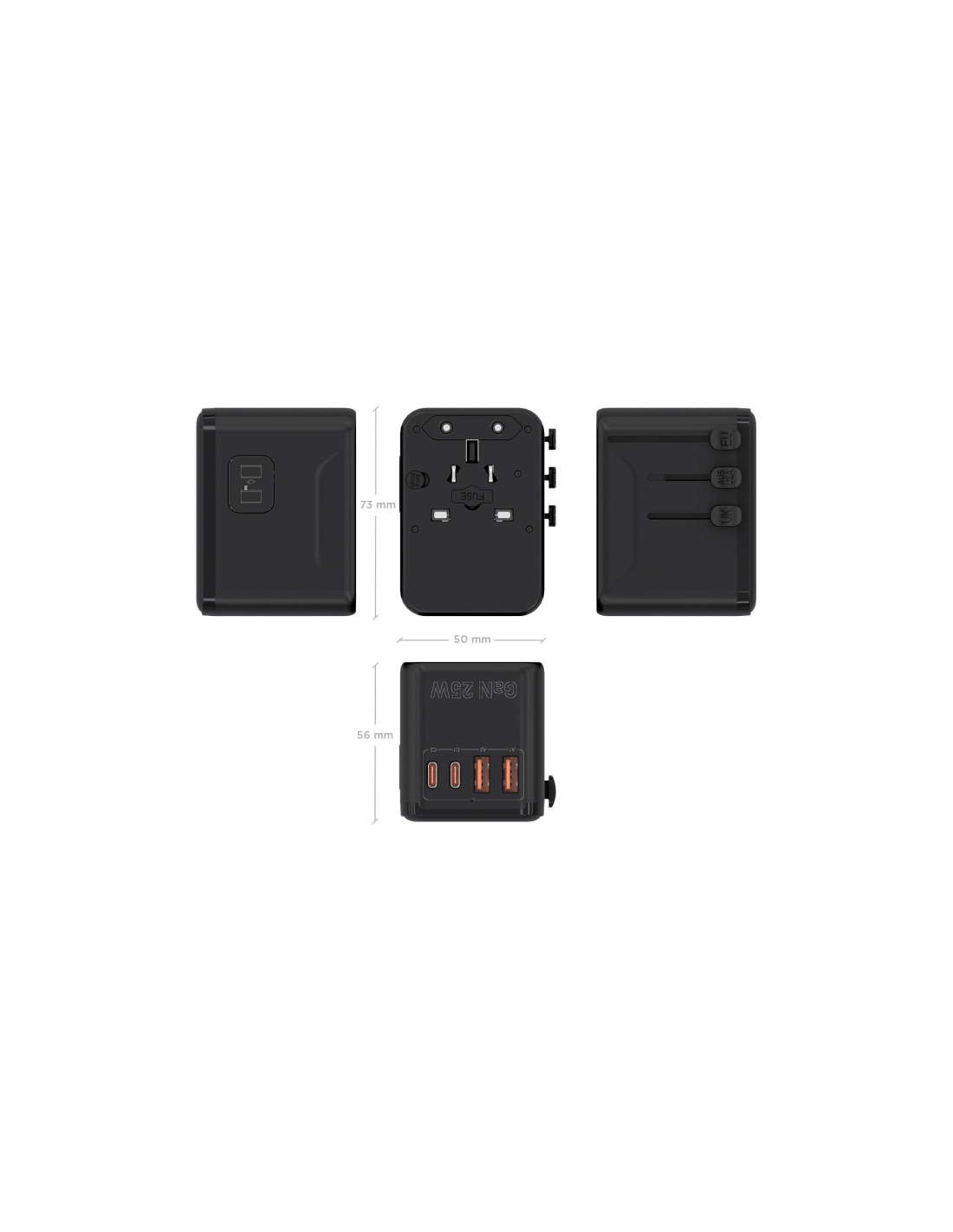 AISENS Adaptador Enchufe Universal Para Viaje EU/USA/UK/AU Con Cargador USB GaN, 2xUSB-A QC3.0, 2xUSB-C PD3.0 25W, Negro. Tipo de cargador: Interior, Alimentación: Corriente alterna, Compatibilidad del cargador: Universal. Voltaje de entrada: 100 - 250 V, Voltaje de salida máximo: 12 V, Corriente de salida de adaptador AC: 3 A. Cantidad de puertos USB 2.0: 2, Número de puertos USB Tipo C: 2, Carga rápida, Funciones de protección de poder: Sobreintensidad, Sobrevoltaje, Sobrecalentamiento, Cortocircuito. Col
